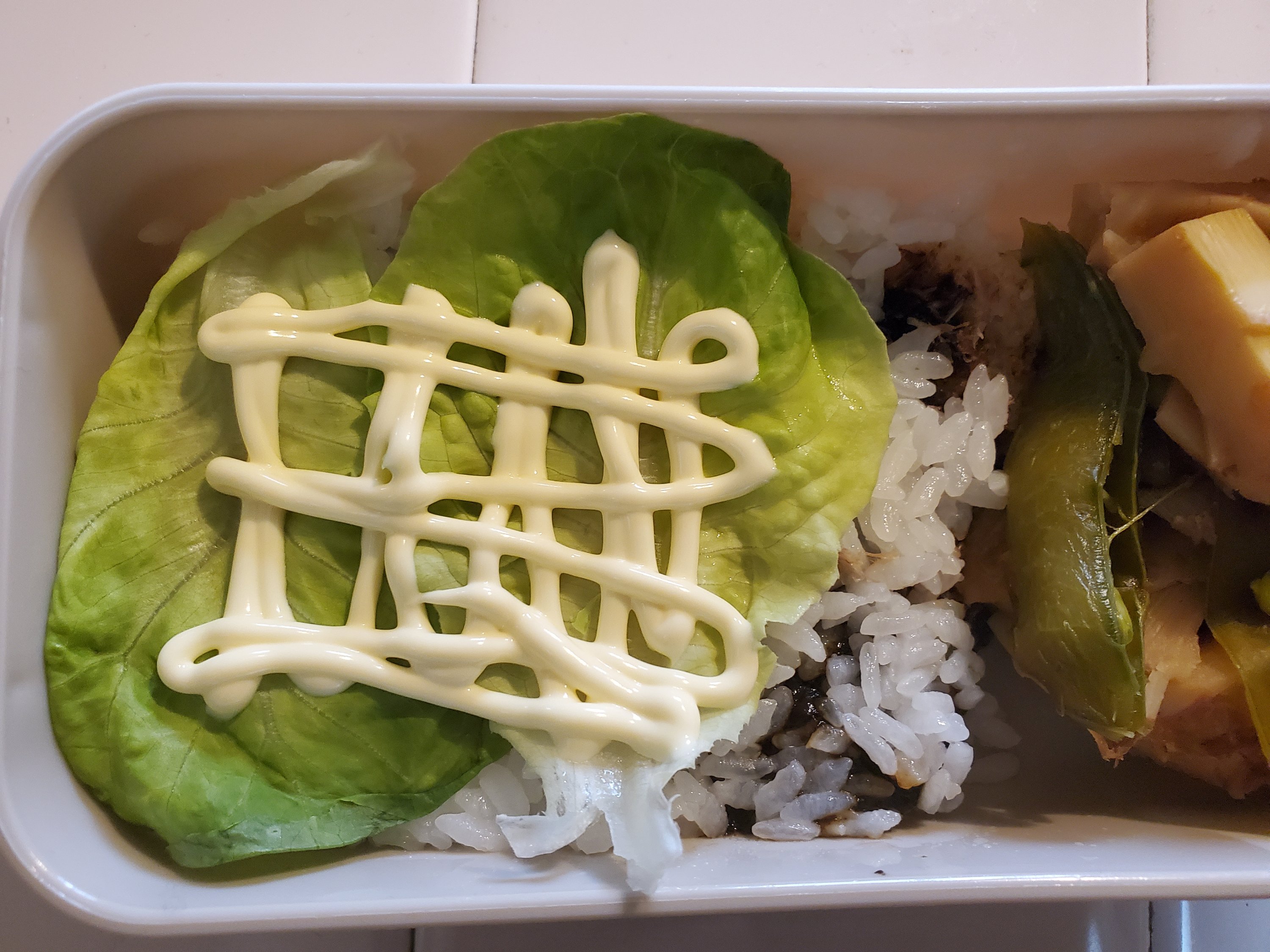 ご飯の上にサラダ菜を敷いてマヨネーズを塗ります。