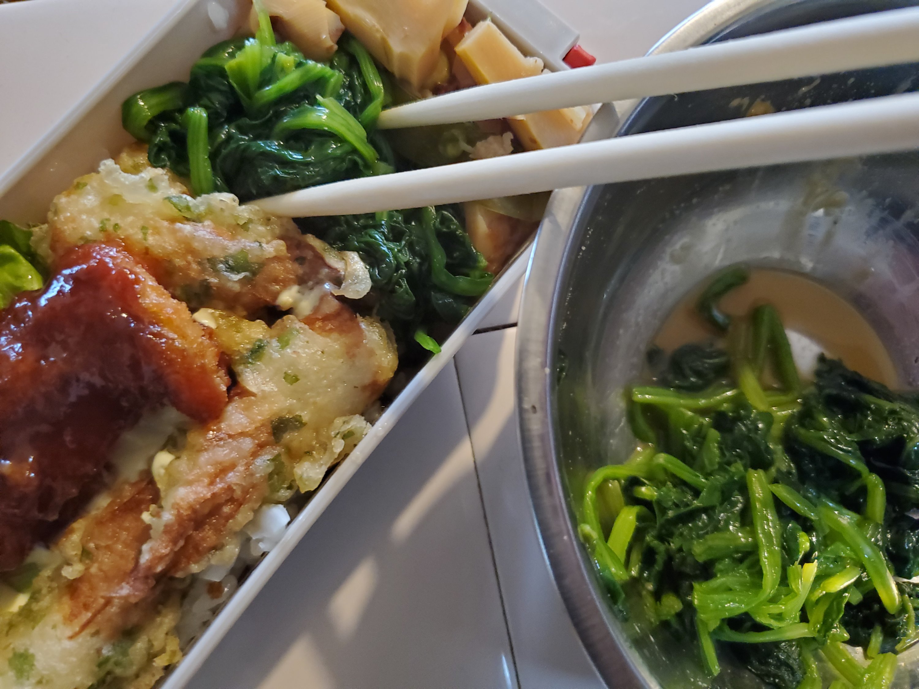 白身フライを載せて、ほうれん草の辛しカラシ和えも彩りに。