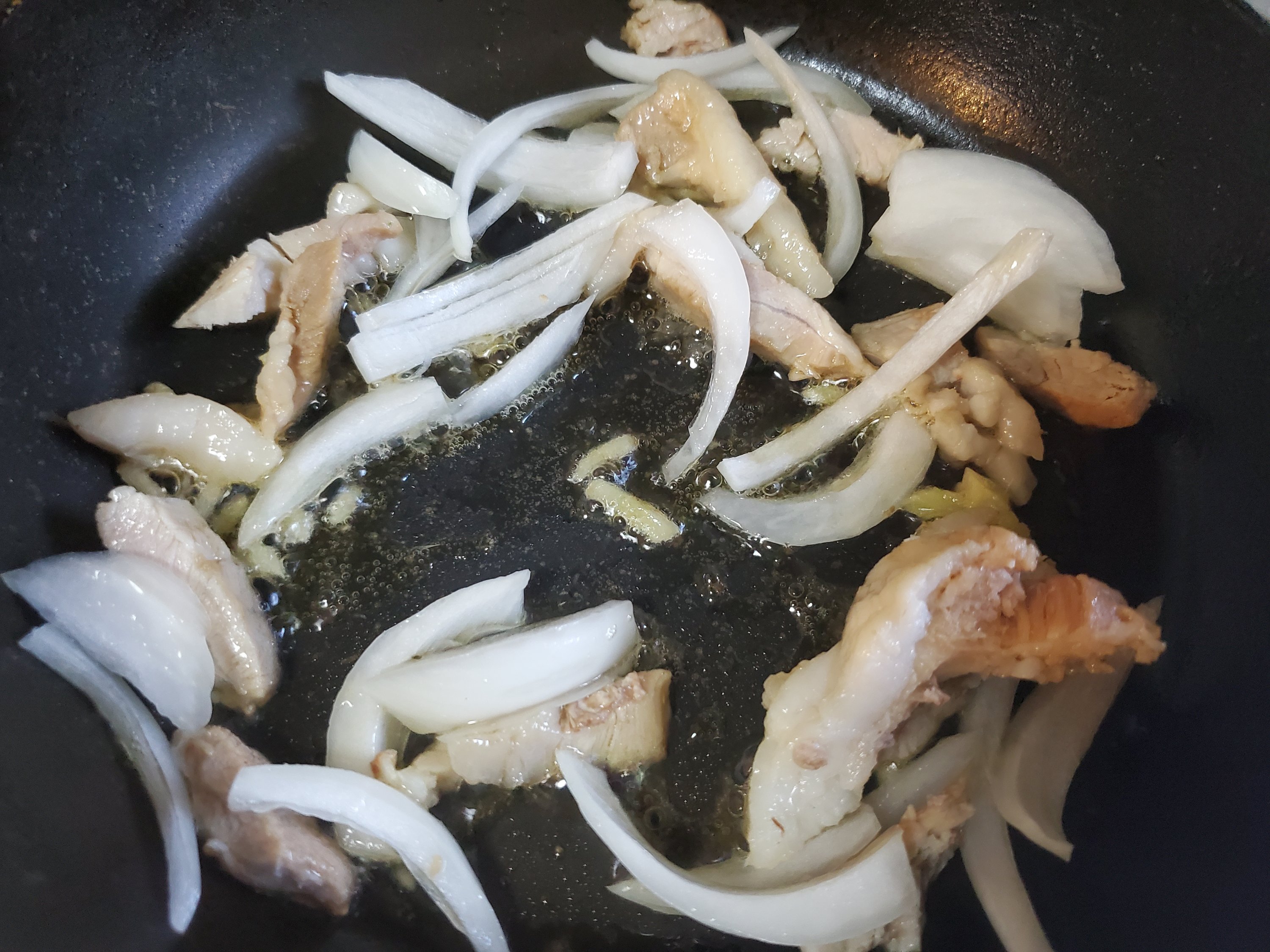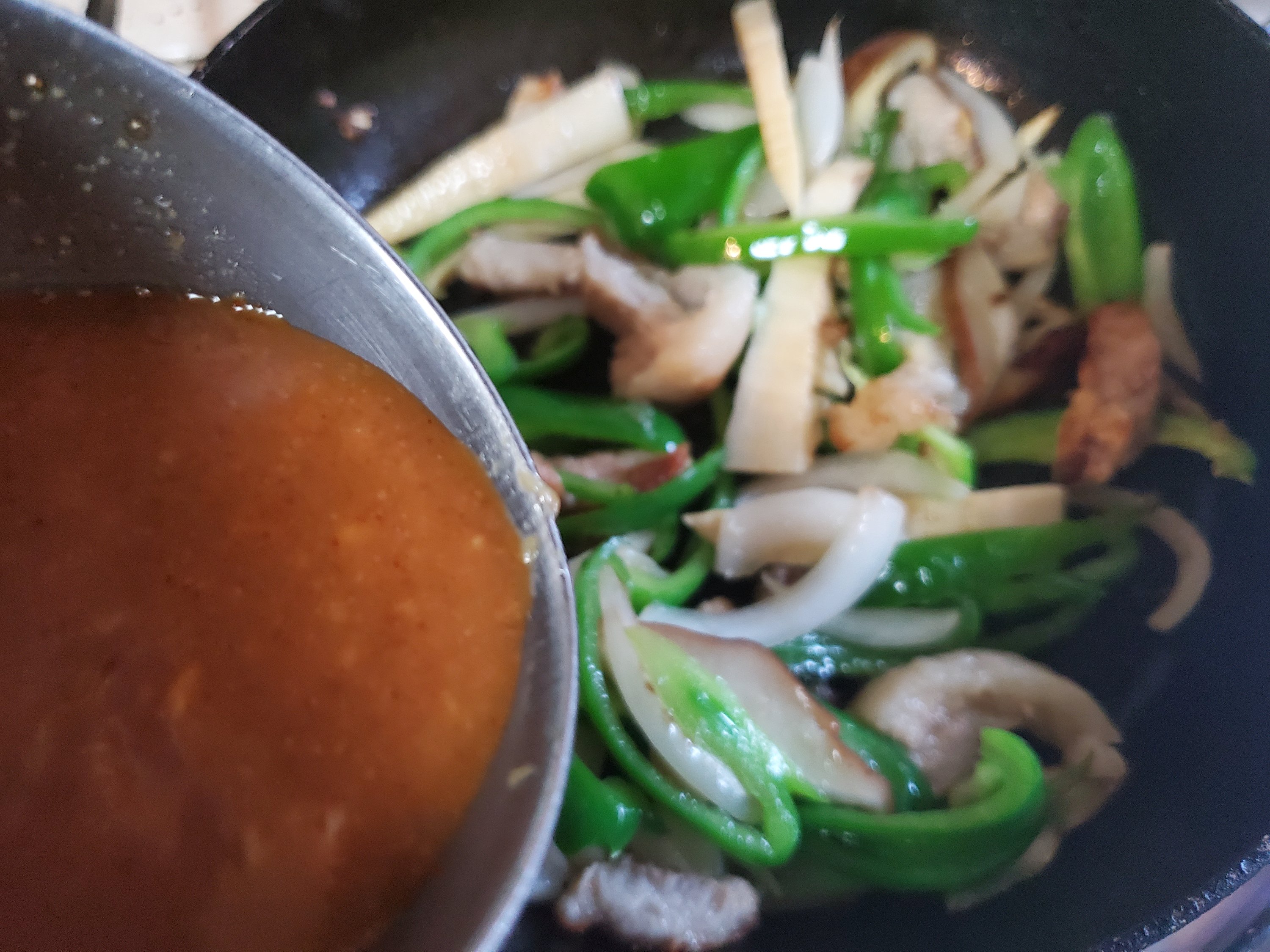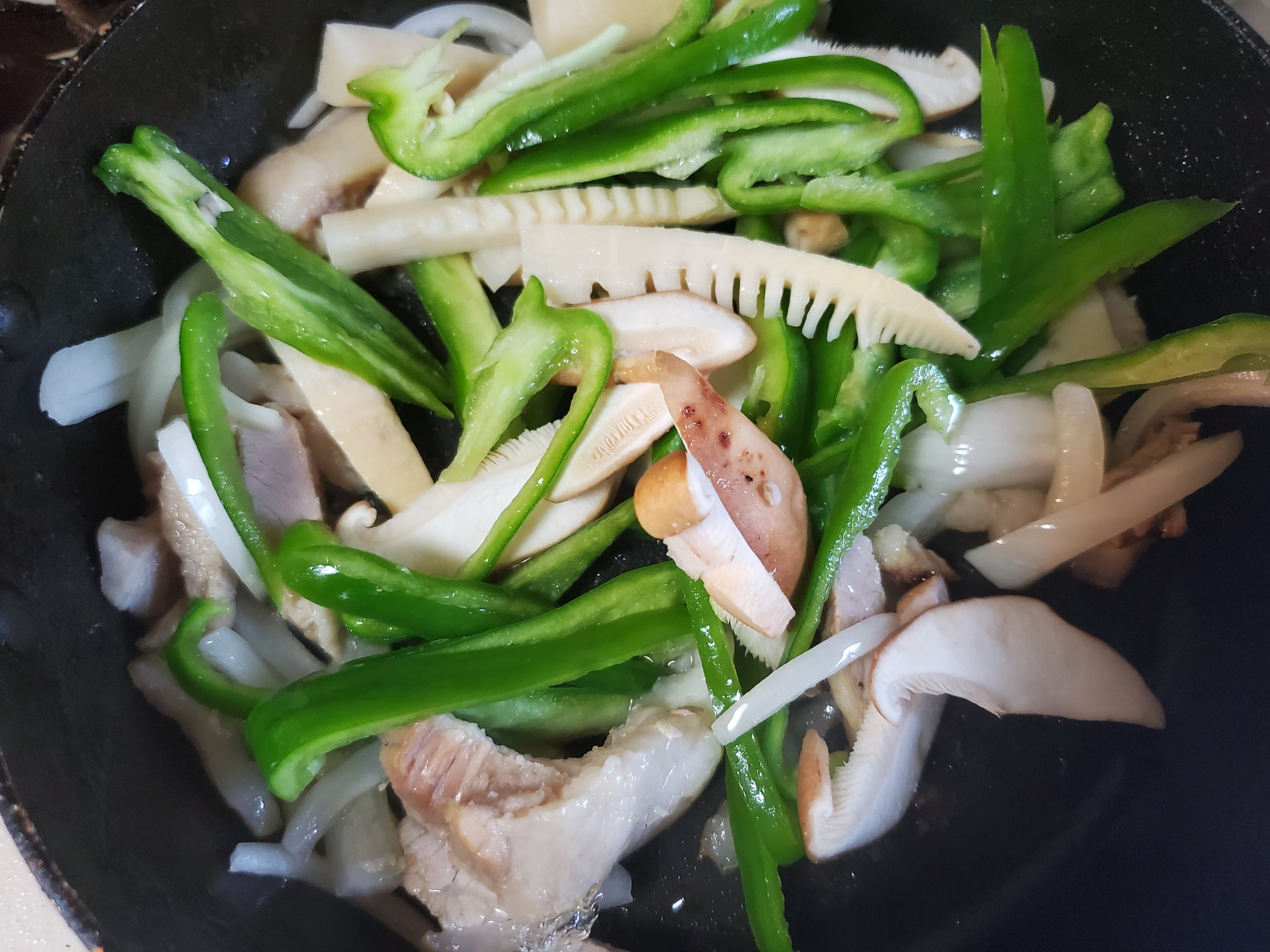 玉ねぎが透き通ってきたら、ピーマン、しいたけ、タケノコを入れて炒め合わせます。