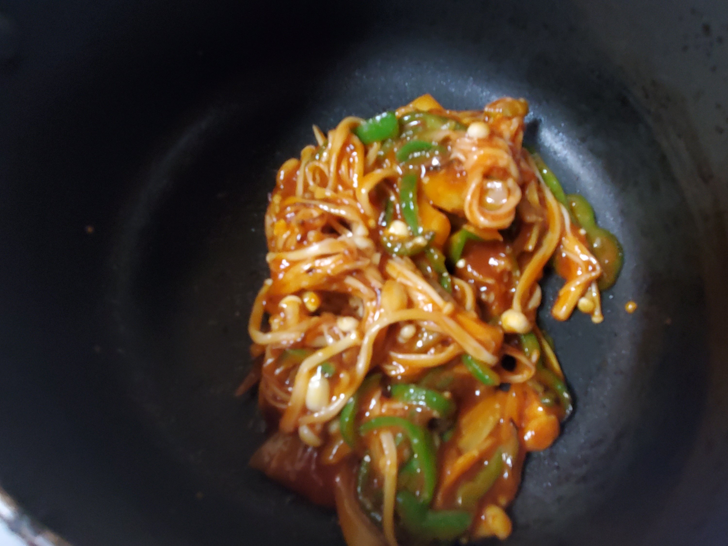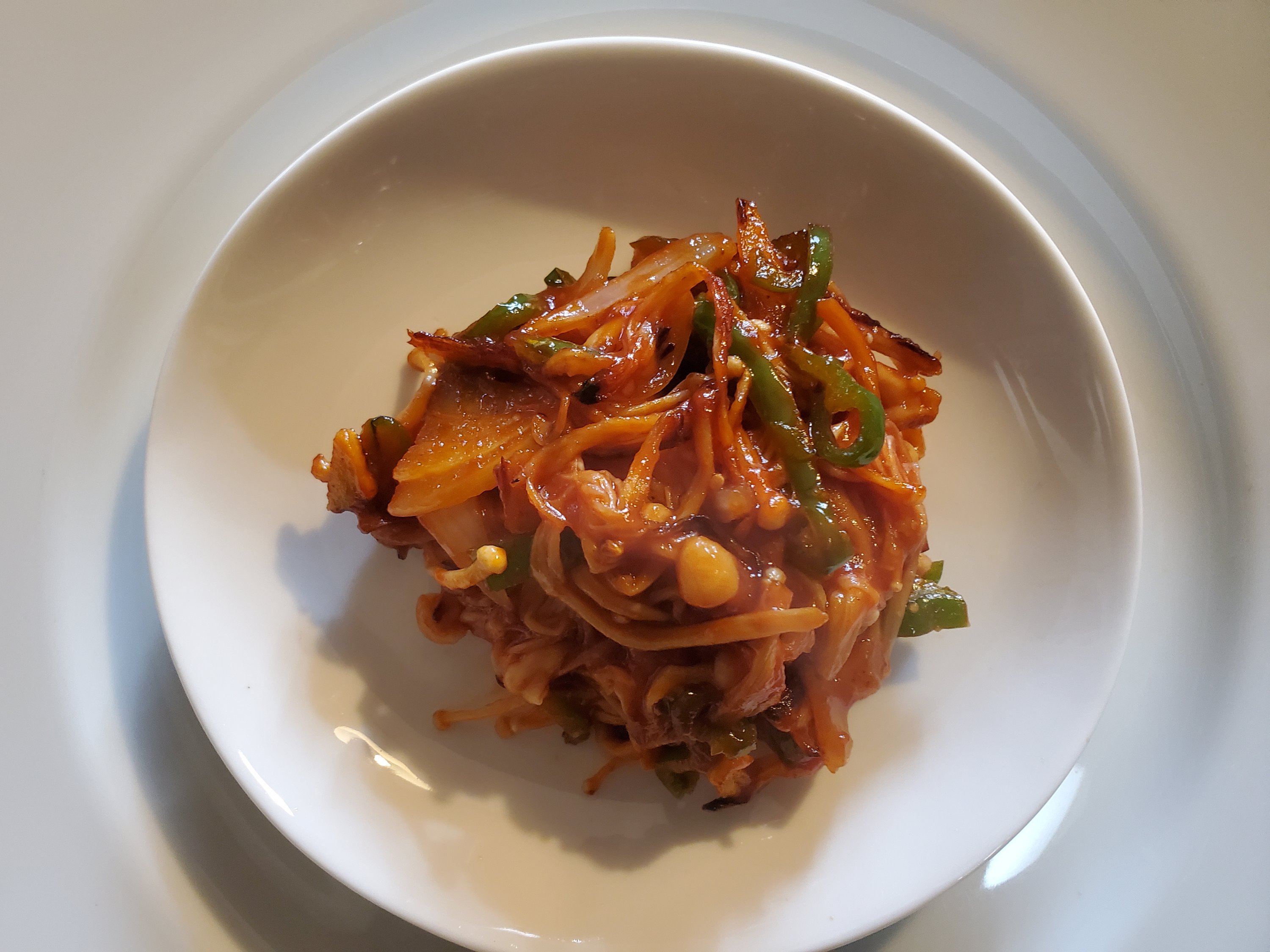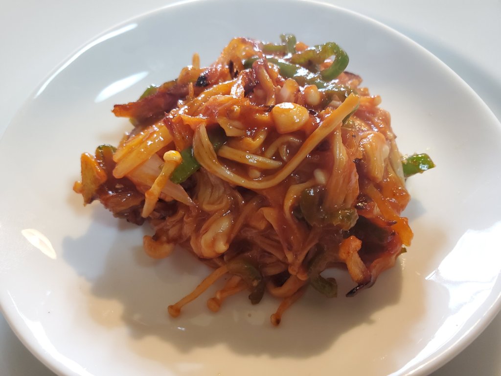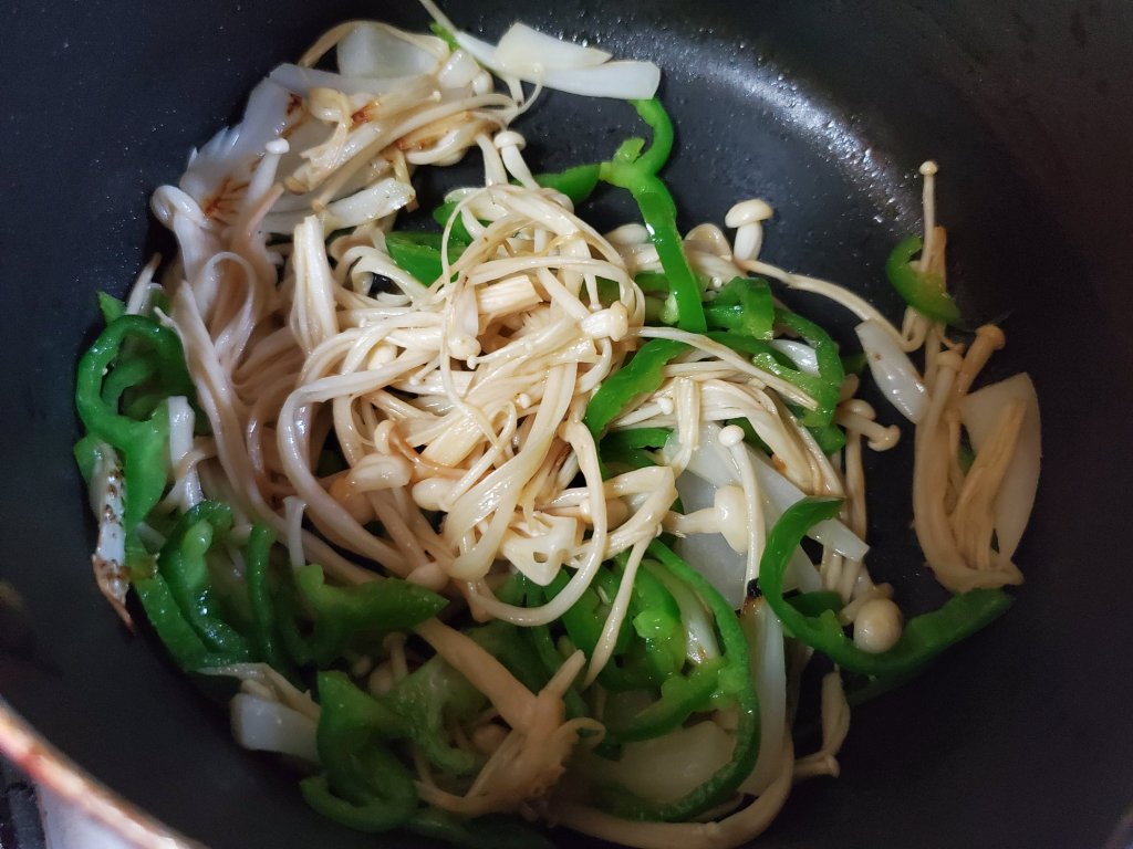 ほぐしたえのき、細切りのピーマン、薄切りの玉ねぎを加えていためます。
