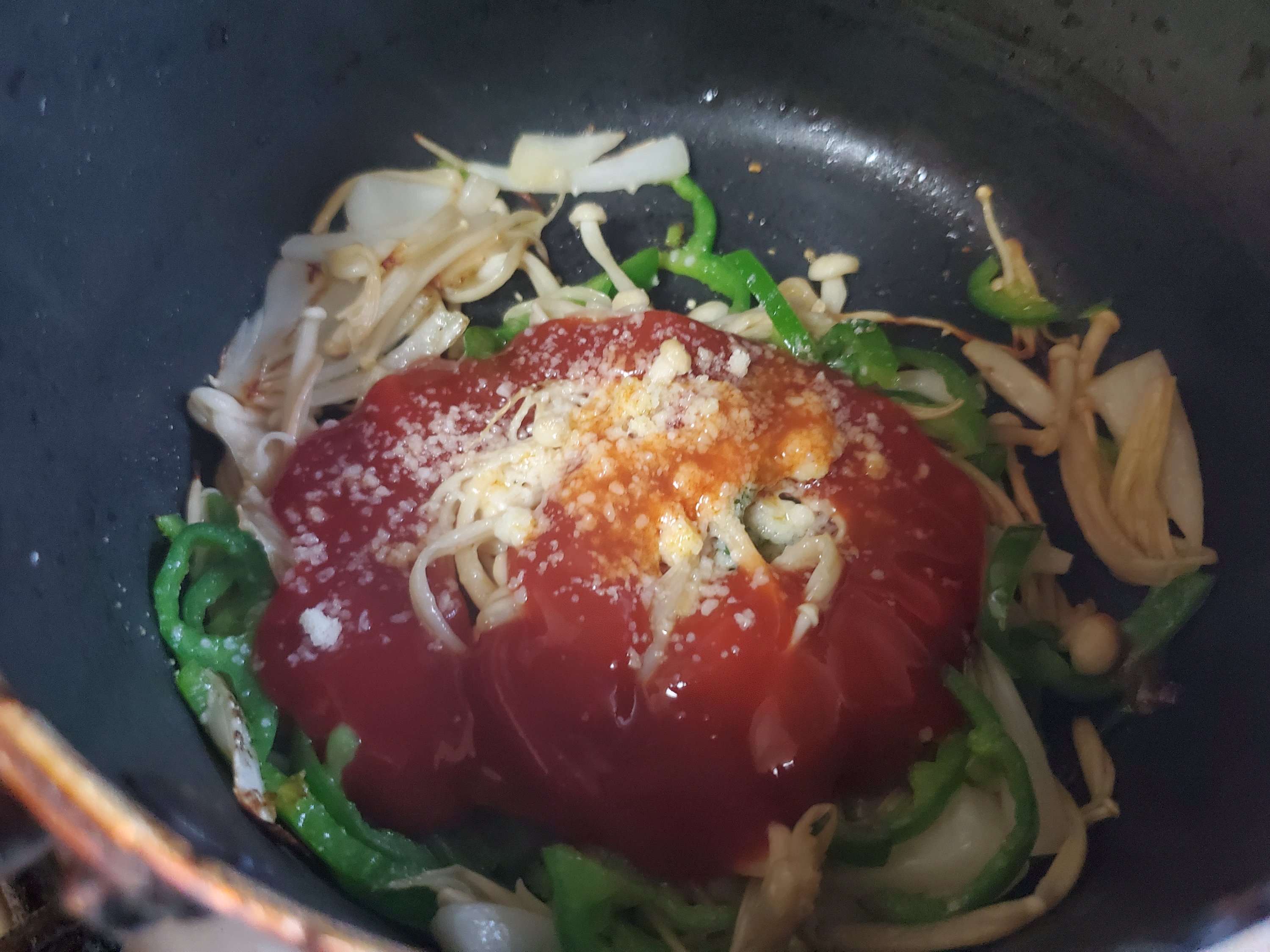 玉ねぎがしんなりとしてきたら、ケチャップとタバスコ、粉チーズを入れてからめます。