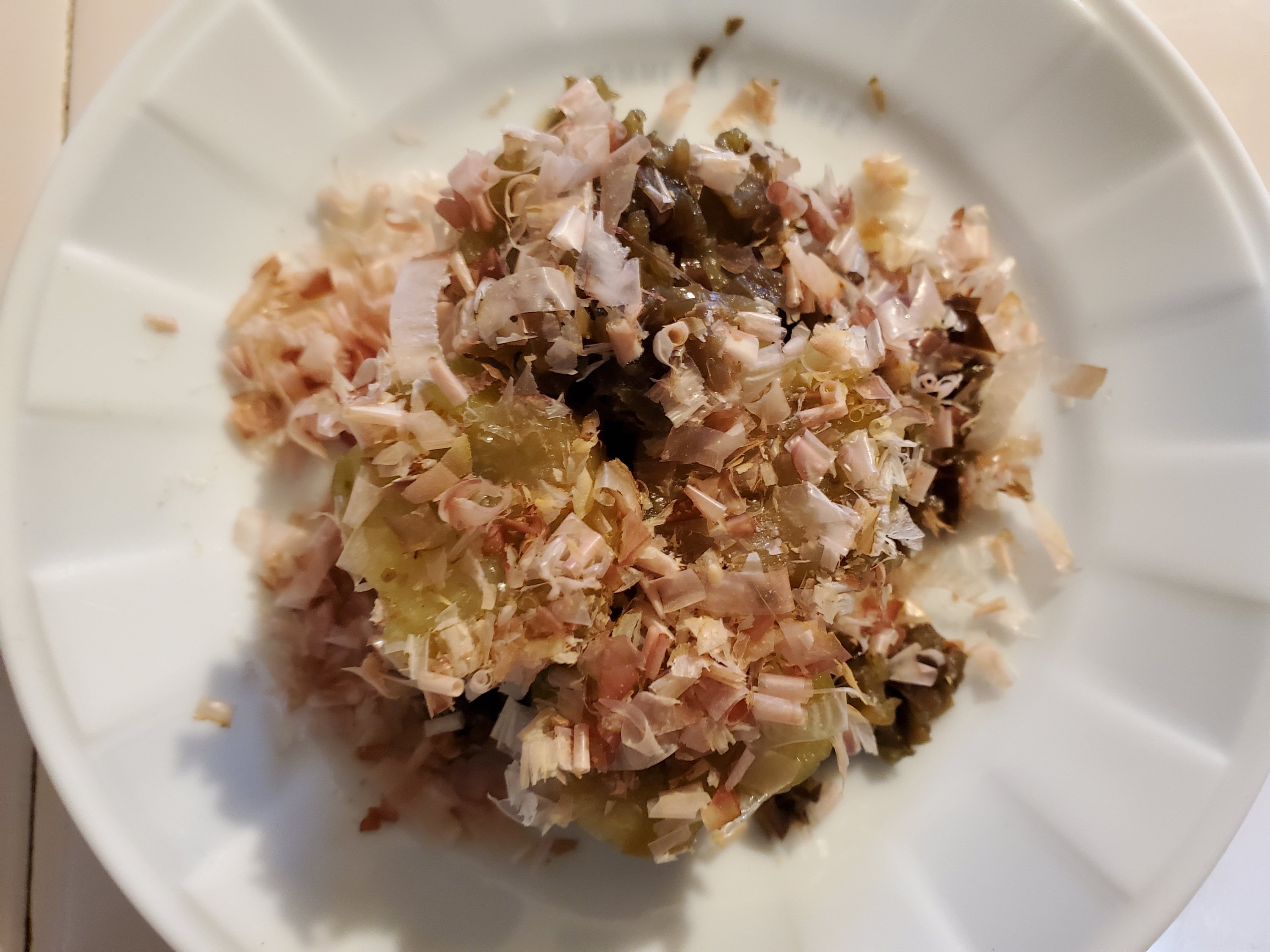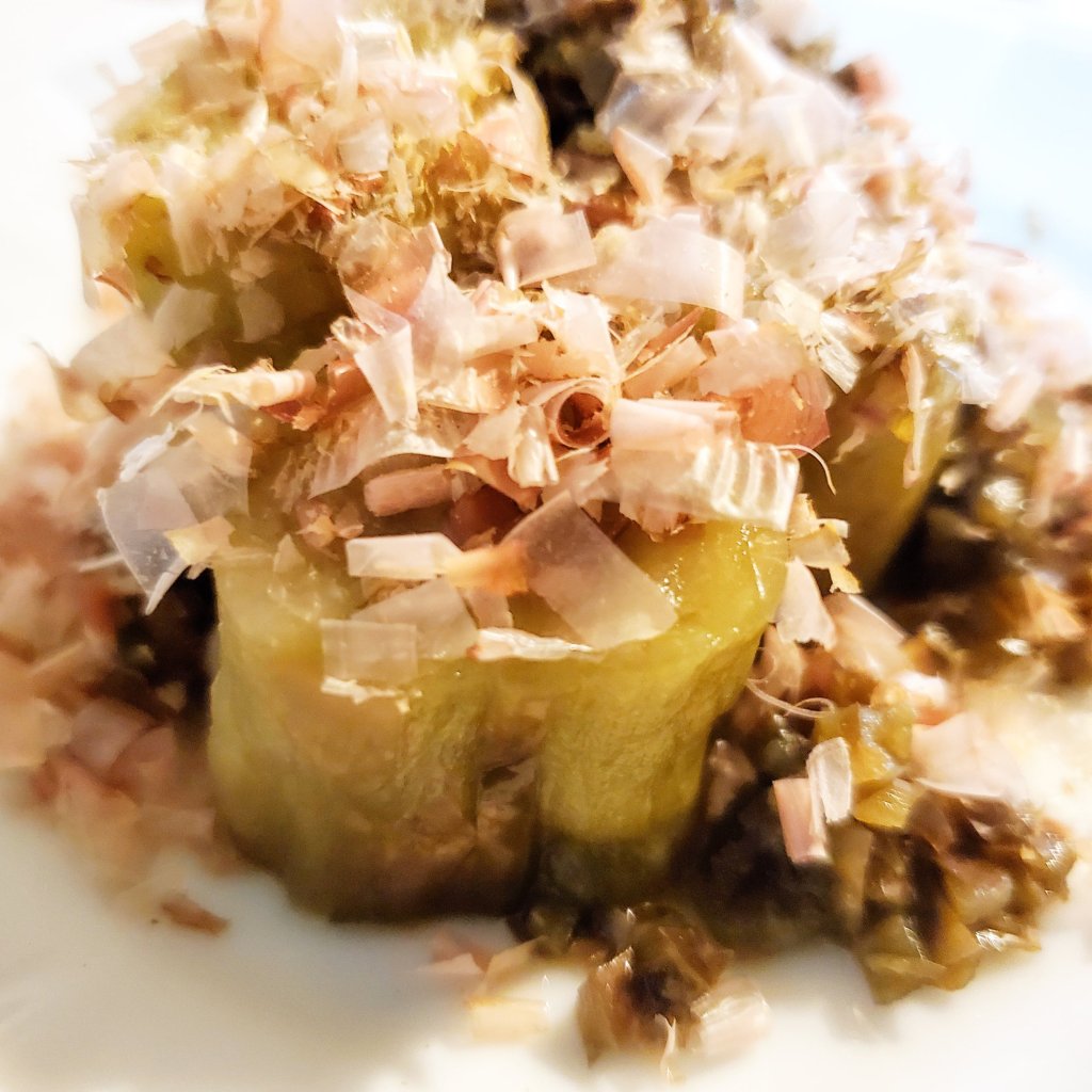 冷たいままお皿に盛り付けてかつおぶしをかけたら、蒸し暑い季節にも美味しい冷やし焼き茄子のできあがりです🍆ナッスリ