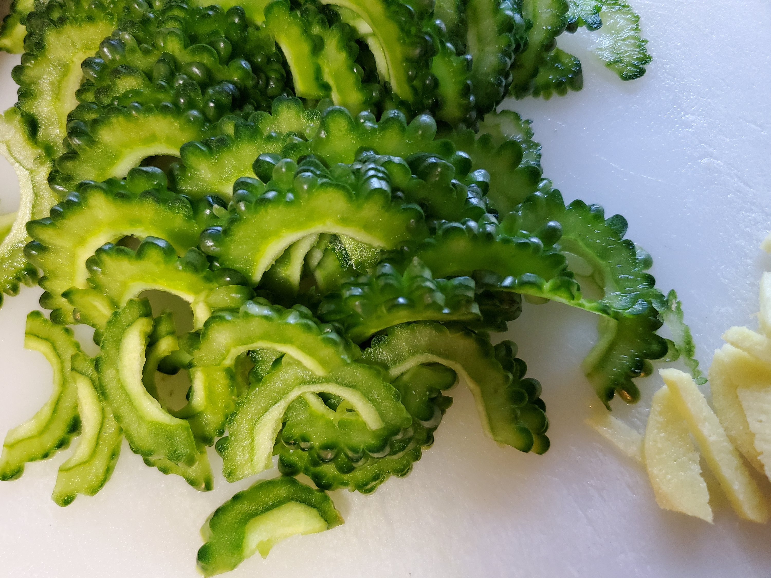 ゴーヤは縦半分に切って種とワタを取り、ごく薄くスライスします。