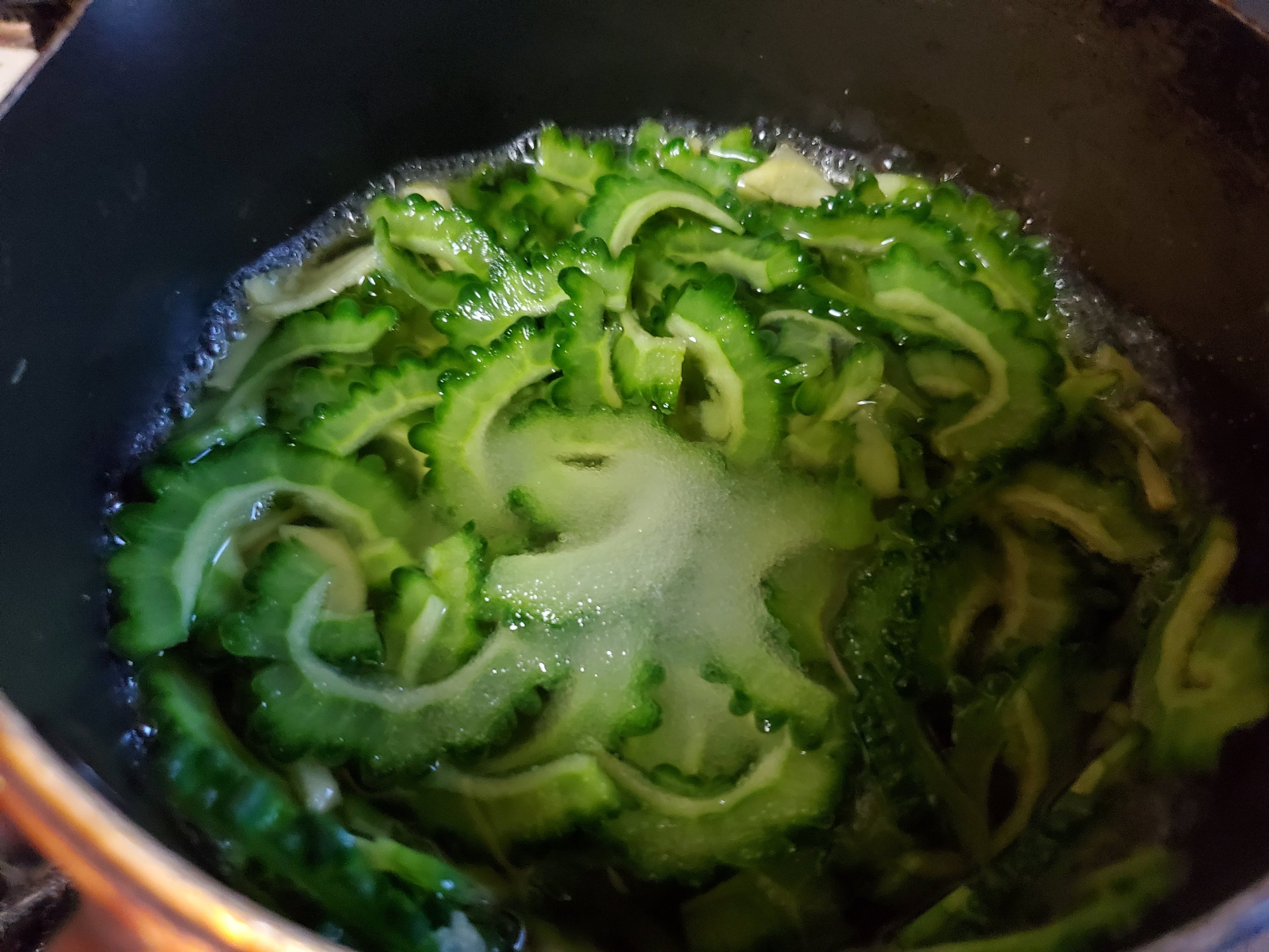 お湯を沸かしてゴーヤをさっと下茹でします。