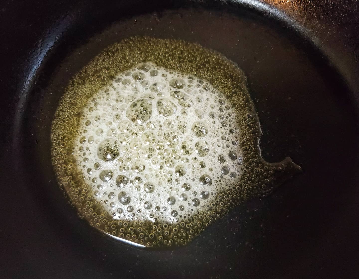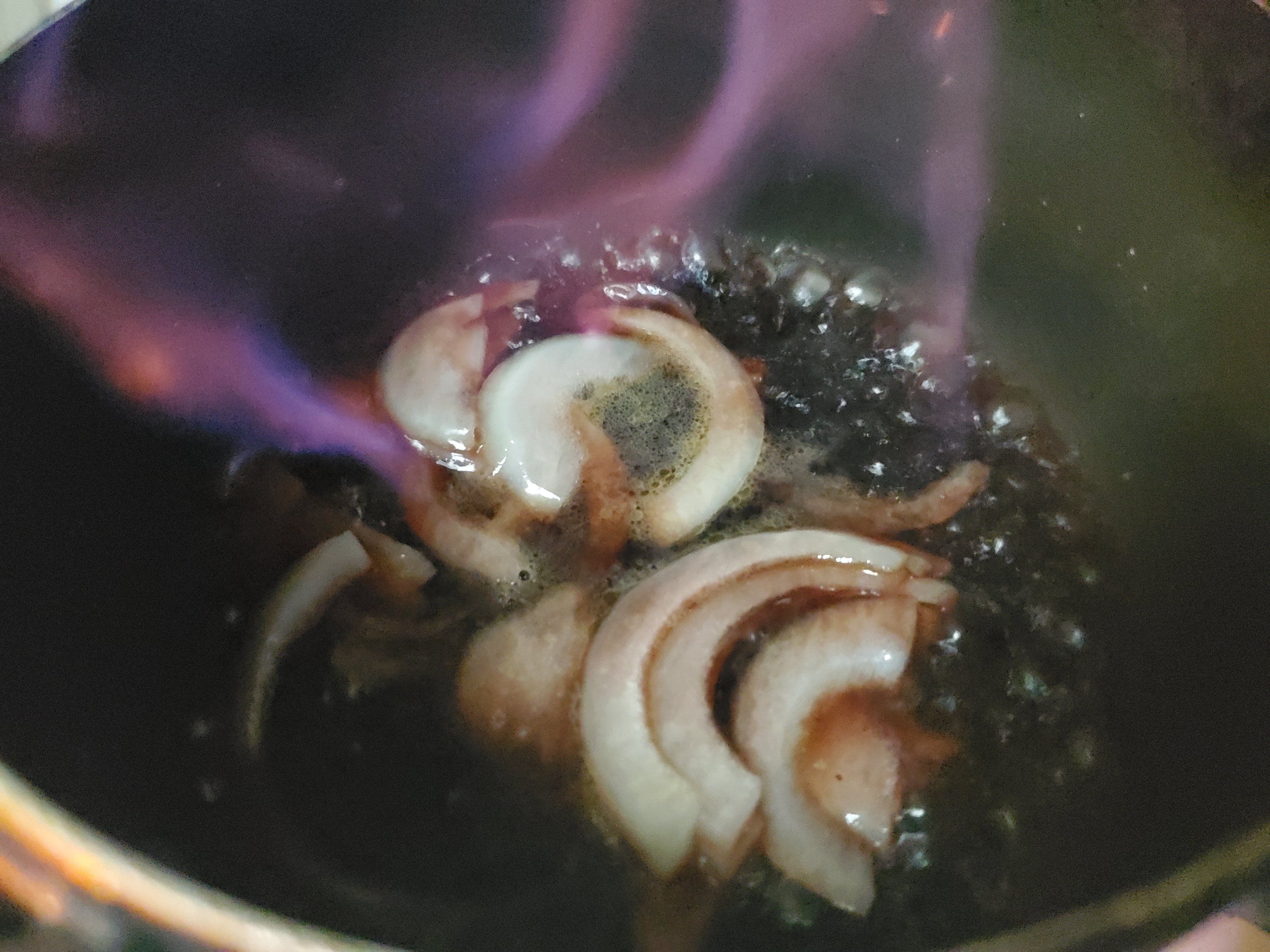 ワインに火が入りますが、アルコールが飛べば自然と消えるので、あわてずに加熱します。