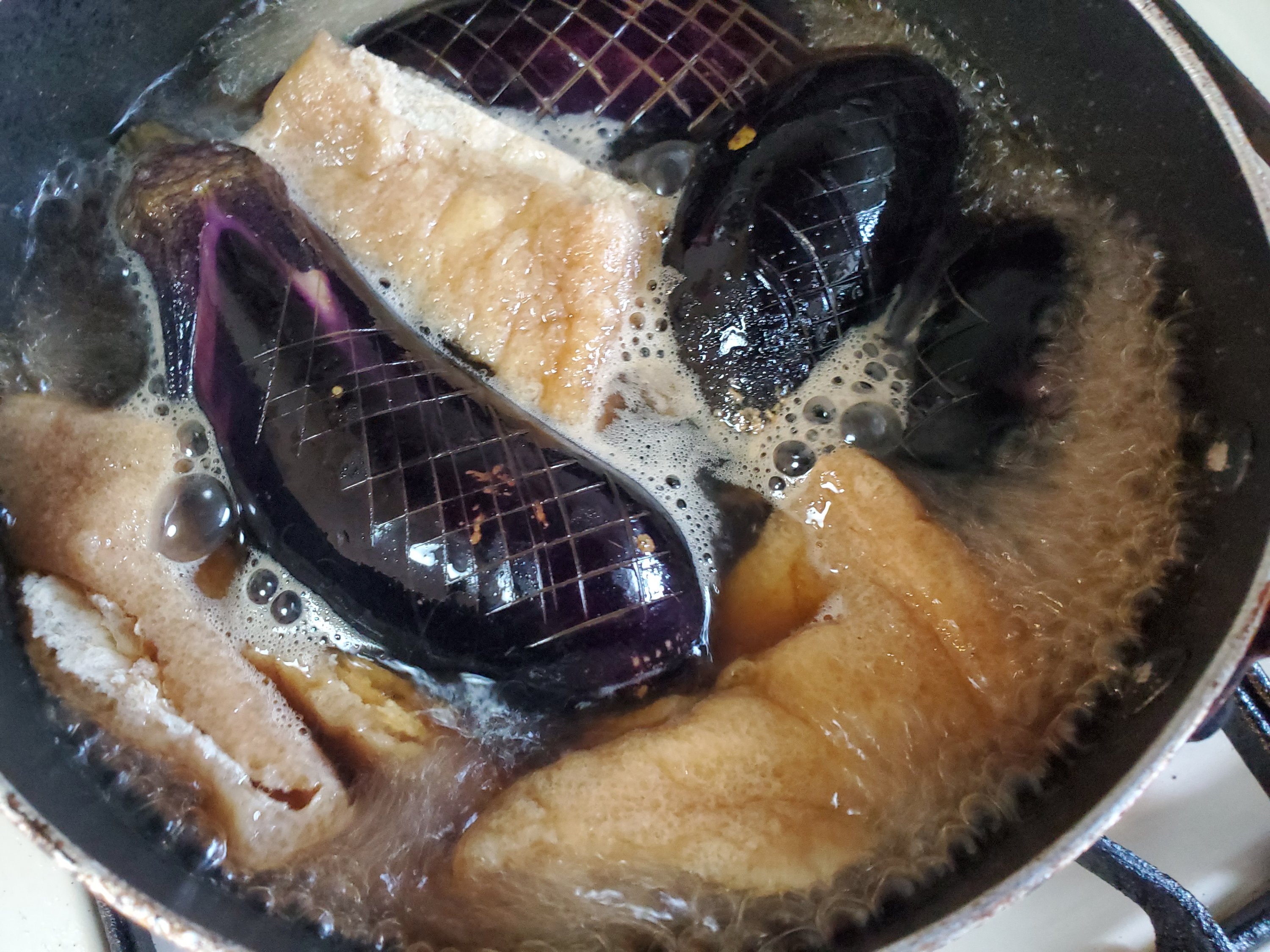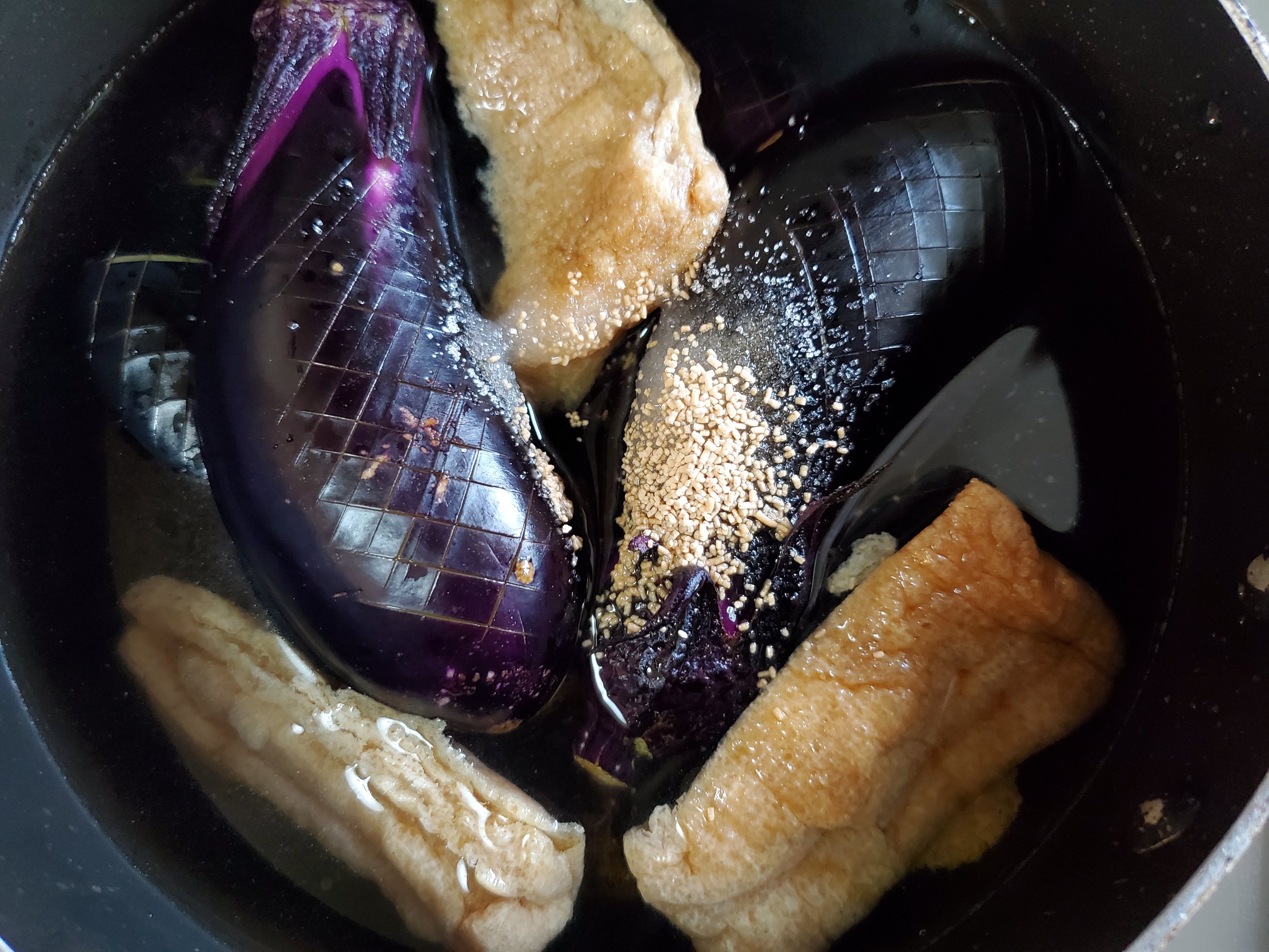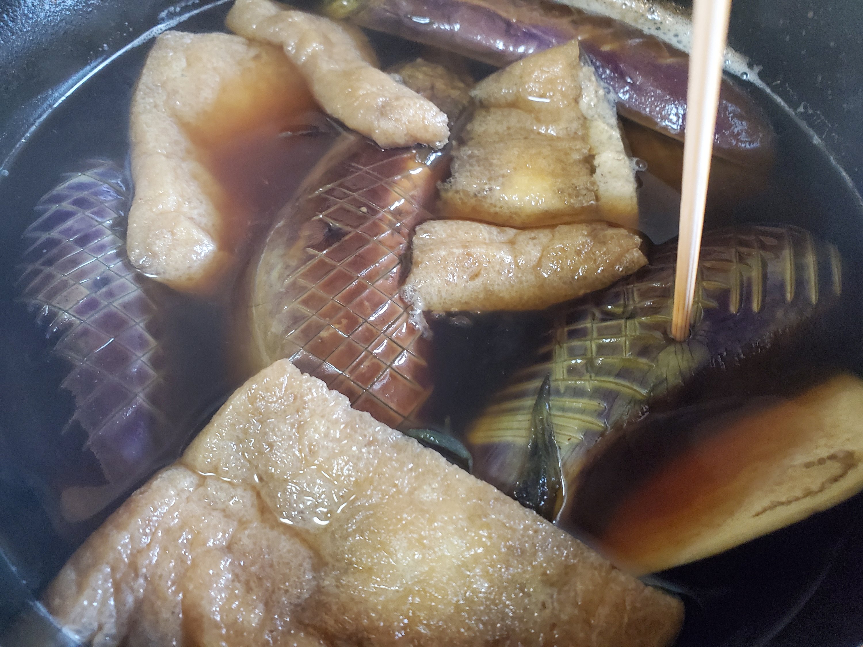 お茄子にすっと箸が通るくらいに煮えたら…おっと、炊けたら、ですね☺