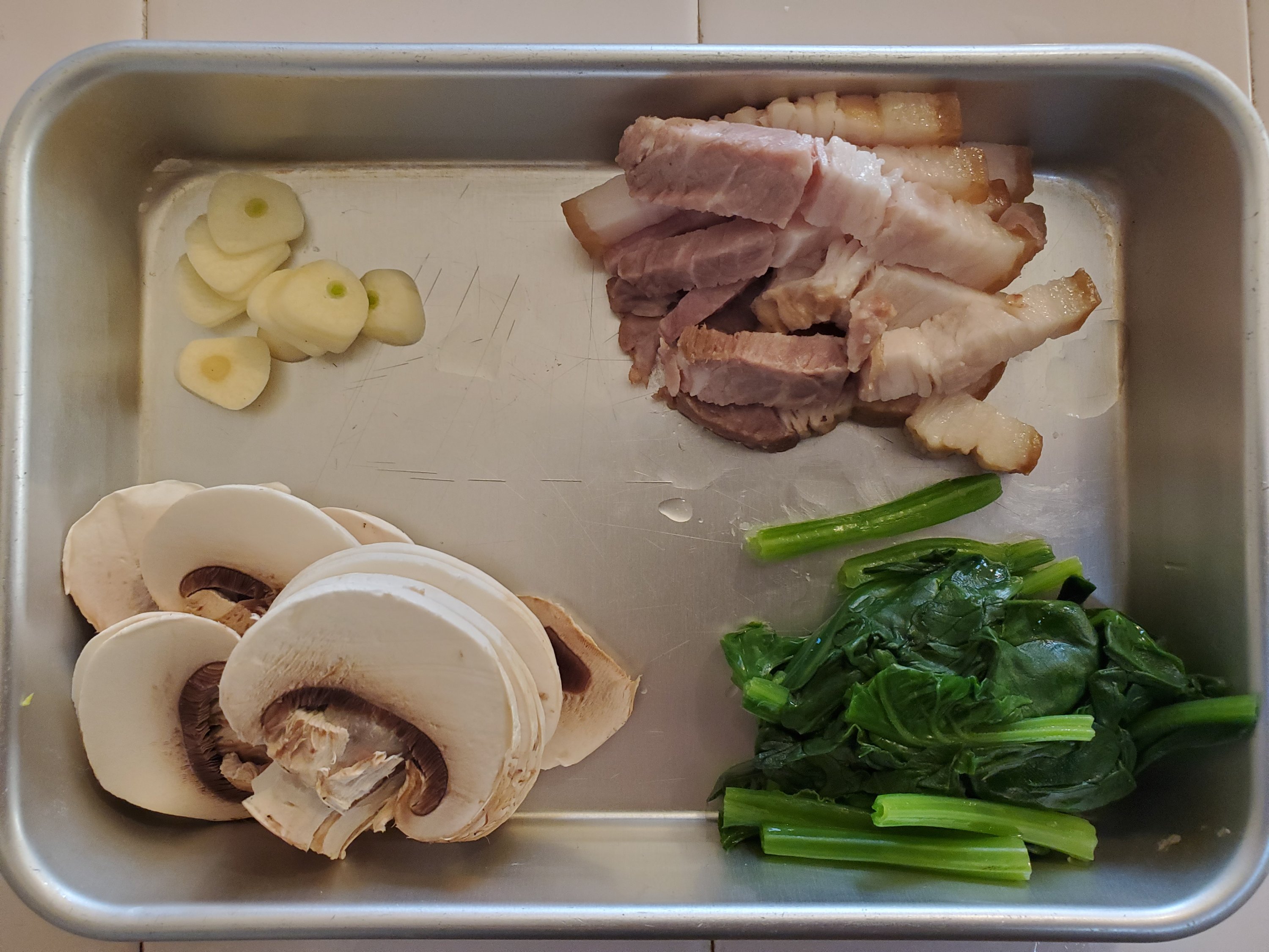 塩豚は豚バラ肉に塩をすり込んで一晩冷蔵庫に置いたものを茹でて作りました。