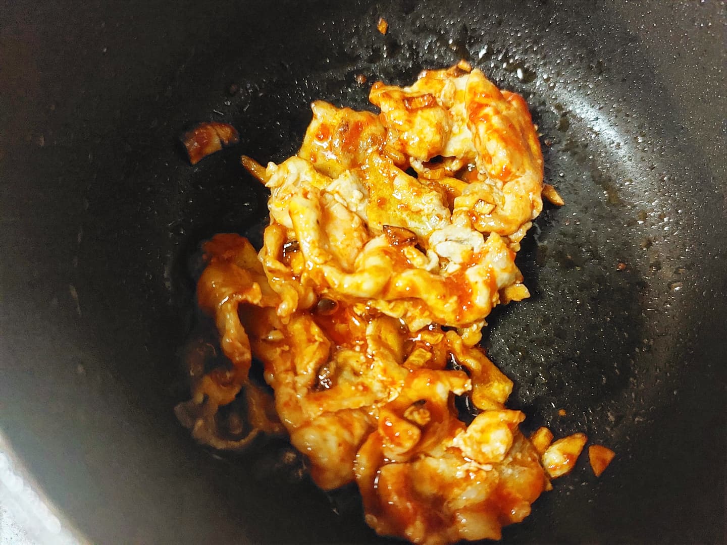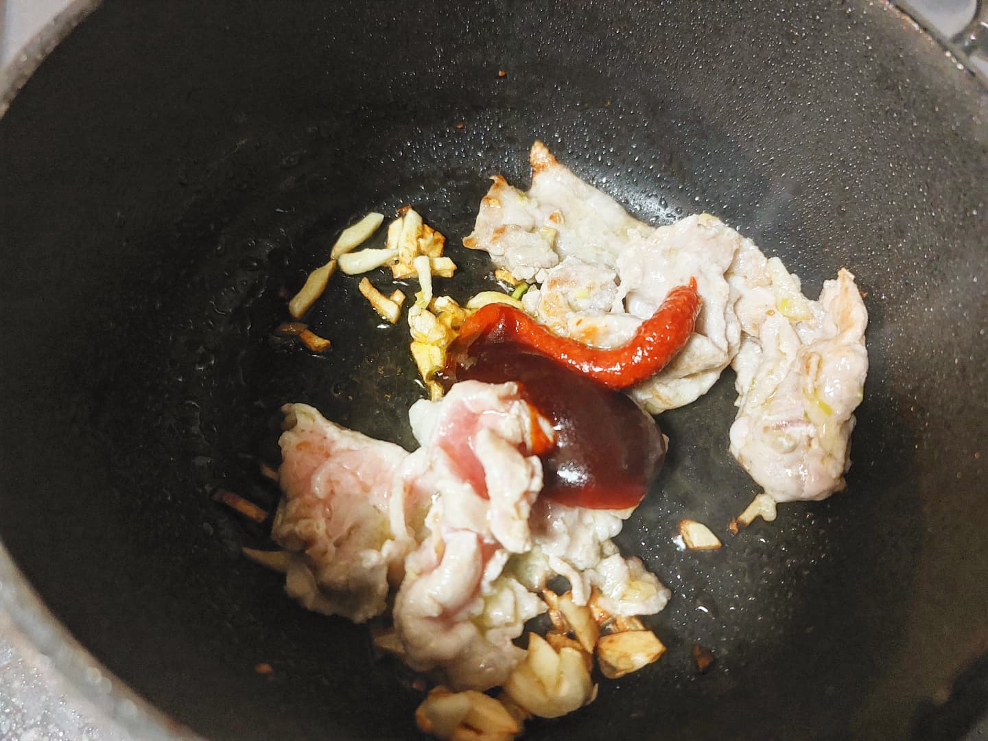 豚肉の色が変わり始めたら、豆板醤とコチュジャンを加えます。