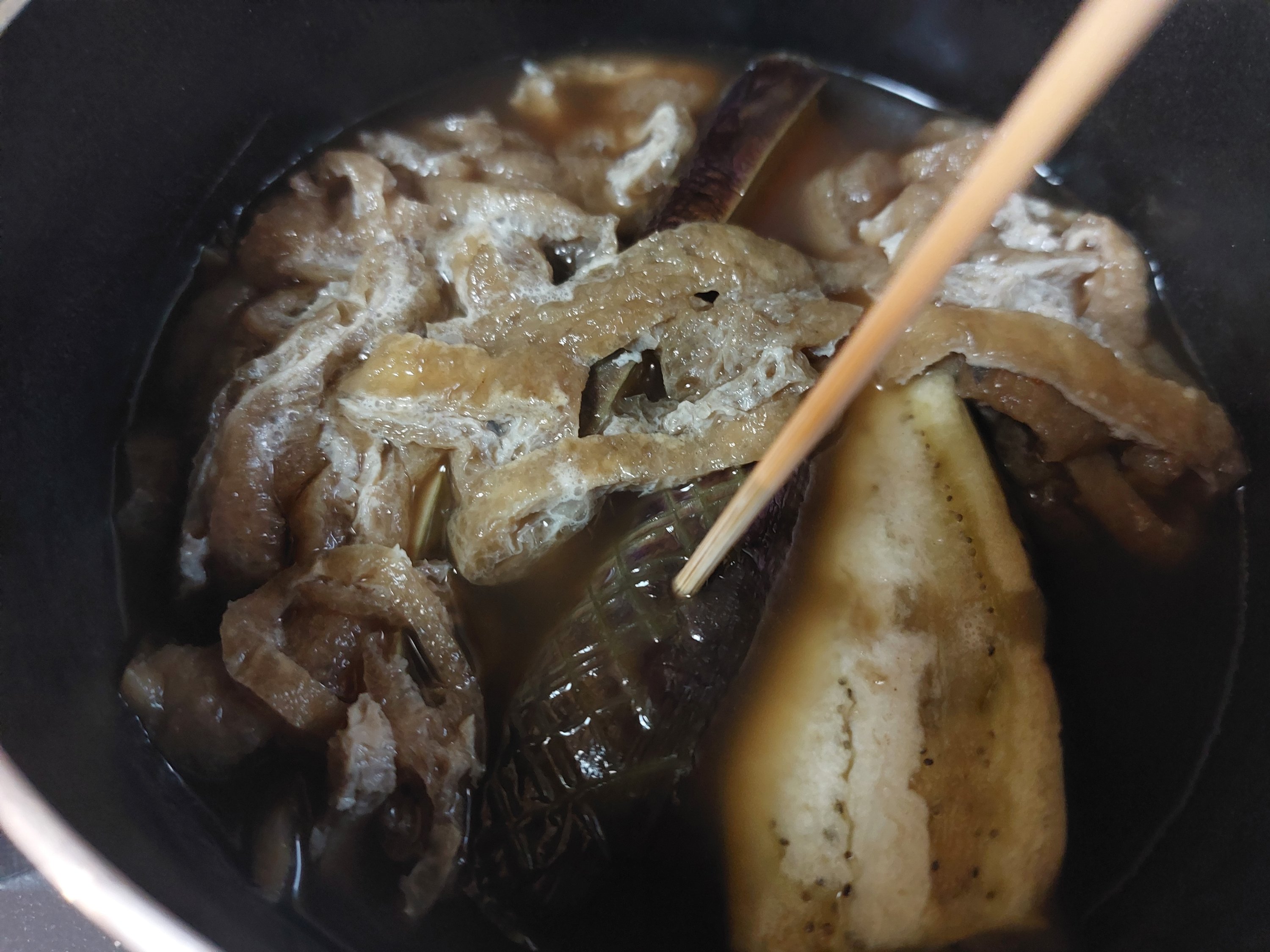 もともと煮ることを炊くという表現をする地方なので、たとえば煮魚は“魚の炊いたん”、今回作った茄子と油揚げの煮物は“お茄子とお揚げさんの炊いたん”という感じで呼んでいます。