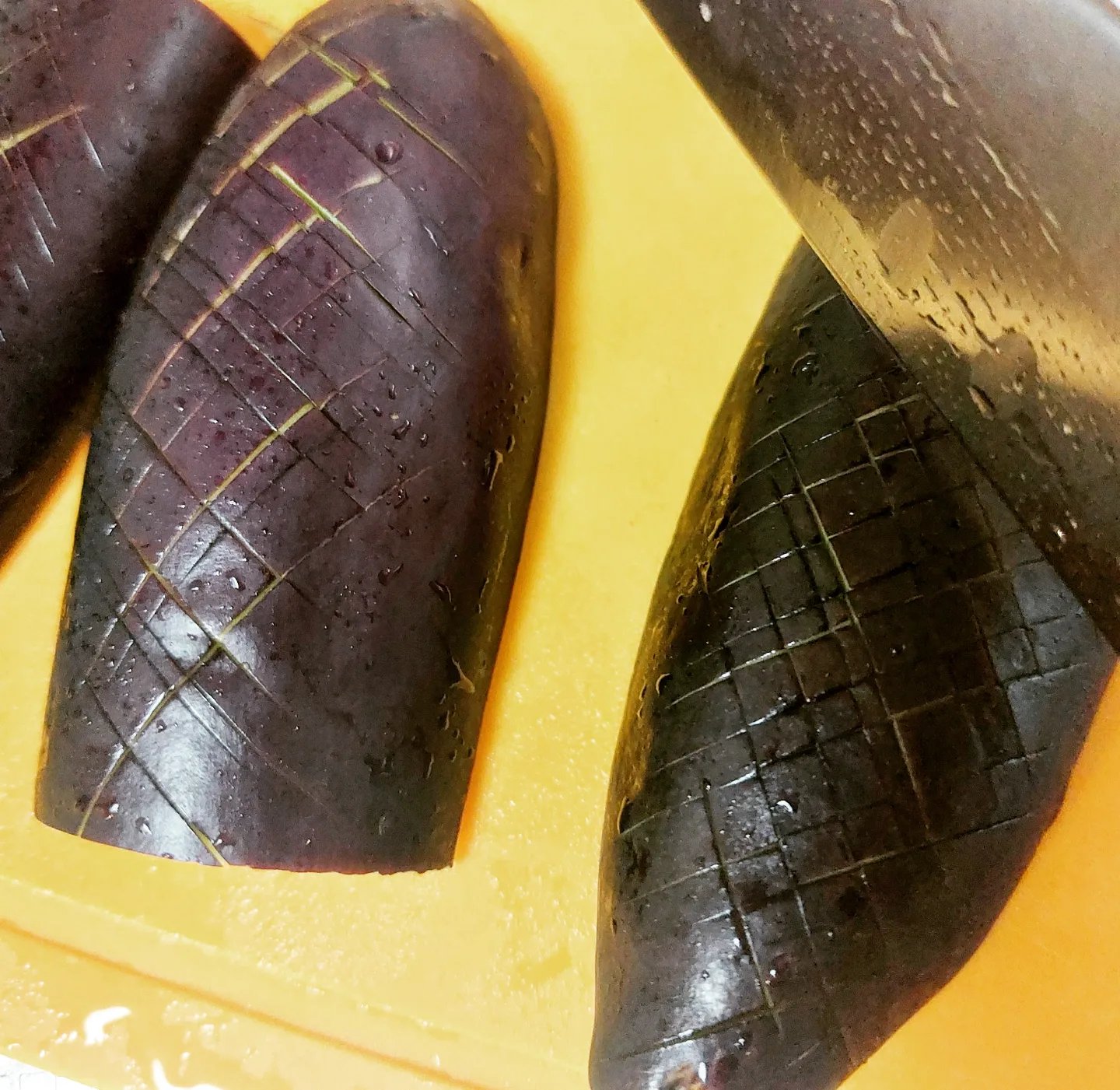 なすは煮ると実の部分はとろとろになりますが、皮は固いので噛み切りやすいように、切り込みを入れておくのがポイントです。