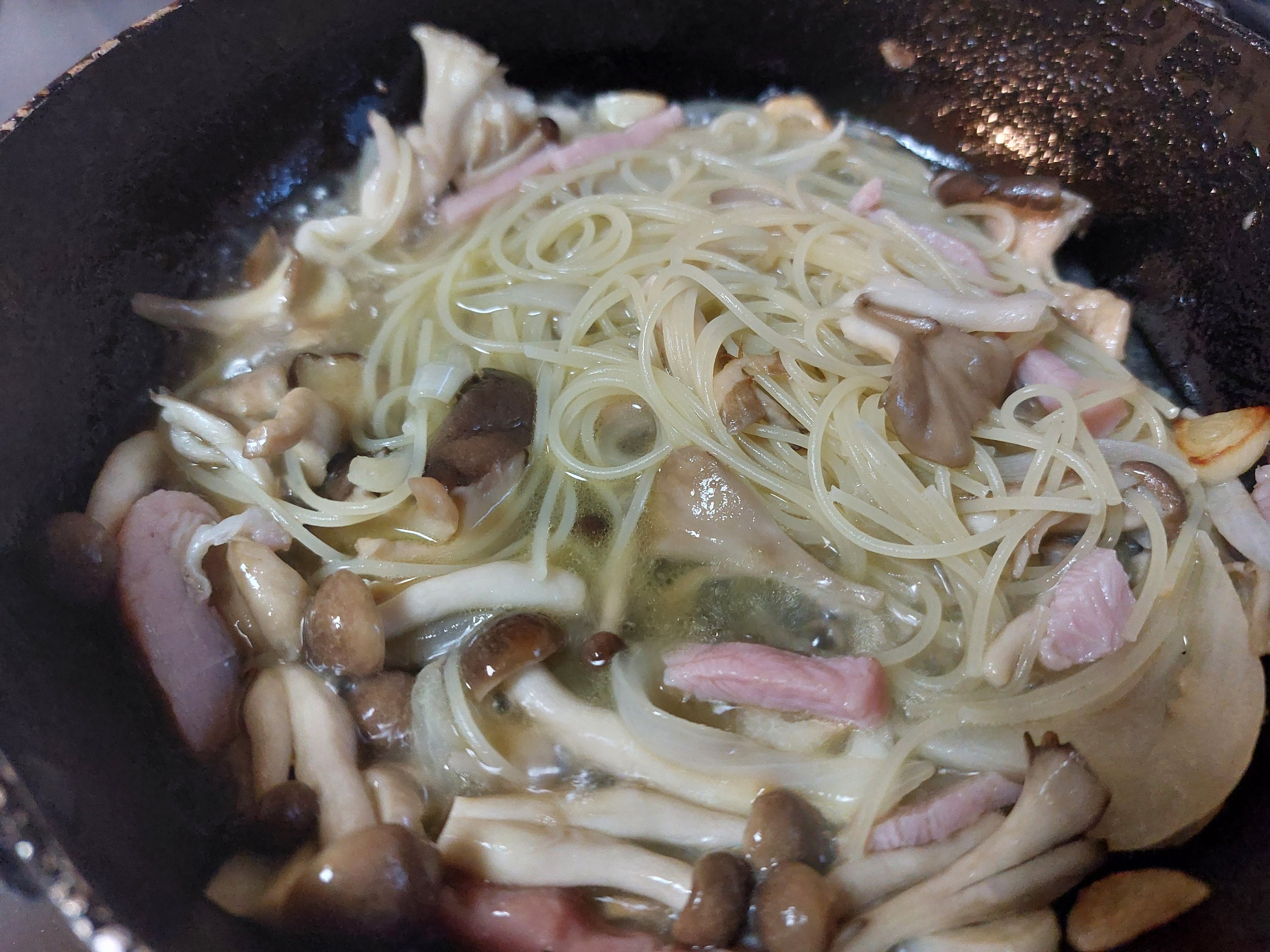 ではまずパスタをゆでてから、具を炒めていきます。