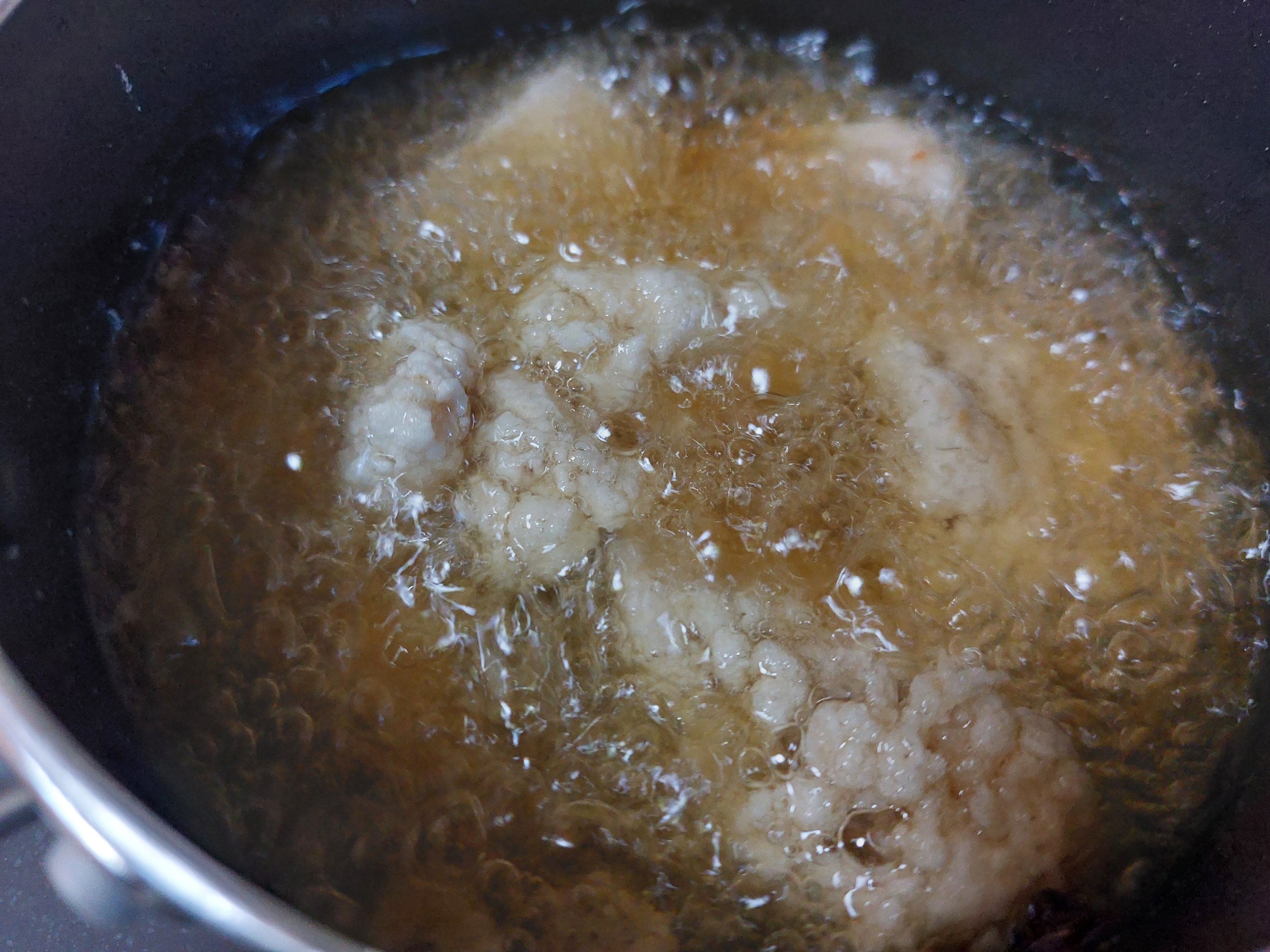 衣で固めて揚げるとその水分がお肉の中に閉じ込められて、ジューシーな食感に揚げあがります。