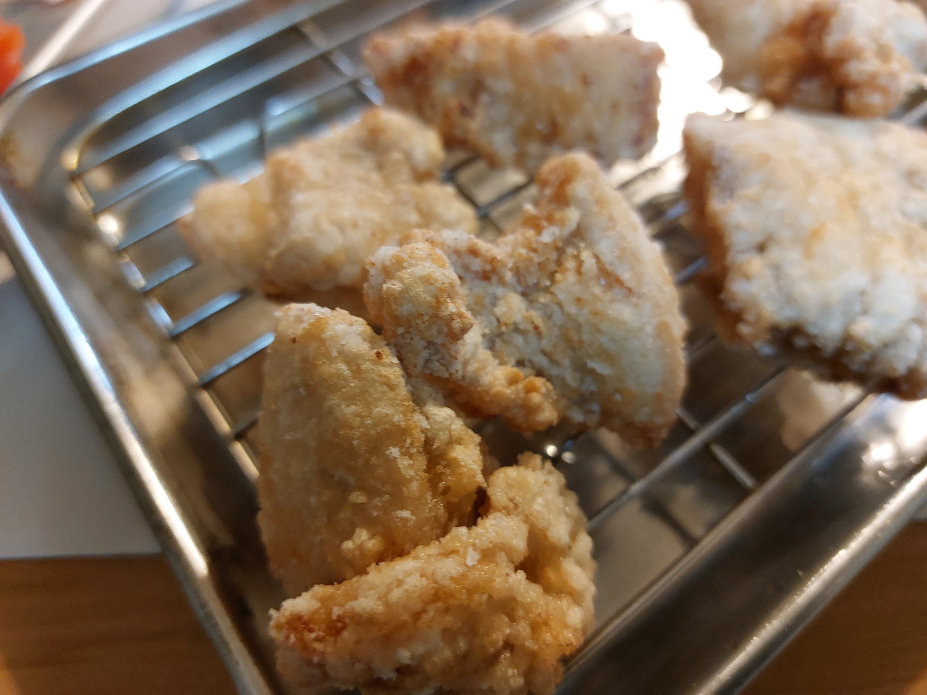 びしょ濡れだと衣に使う粉が溶けてしまって揚げたときにべったりとしてしまうので、表面の水分はしっかり取りたいのですが、中の水分は残したままにするのがジューシーに仕上げるポイントです。