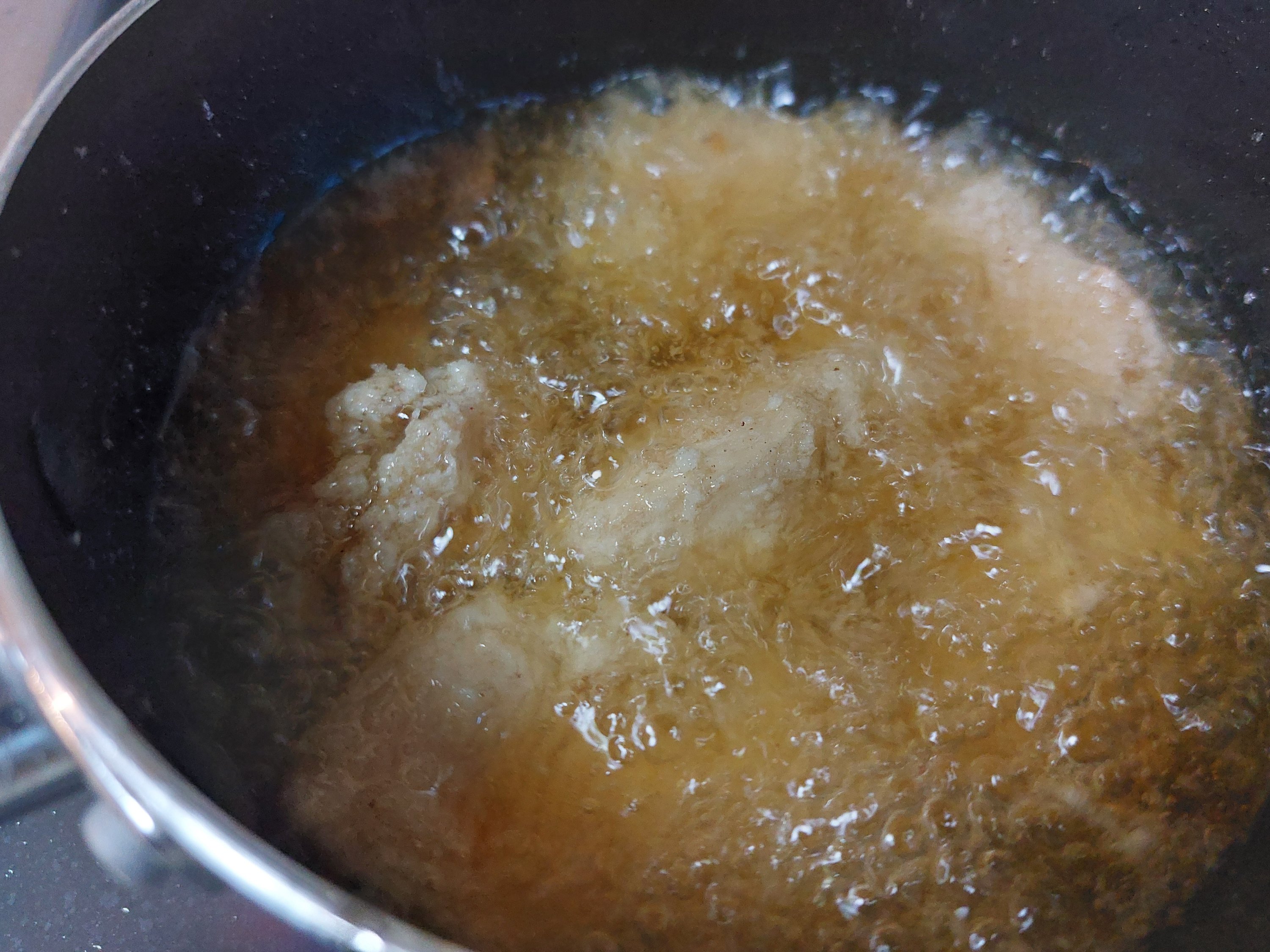 揚げあがりのタイミングで火を強くして油の温度を揚げて、表面をかりっと仕上げます。