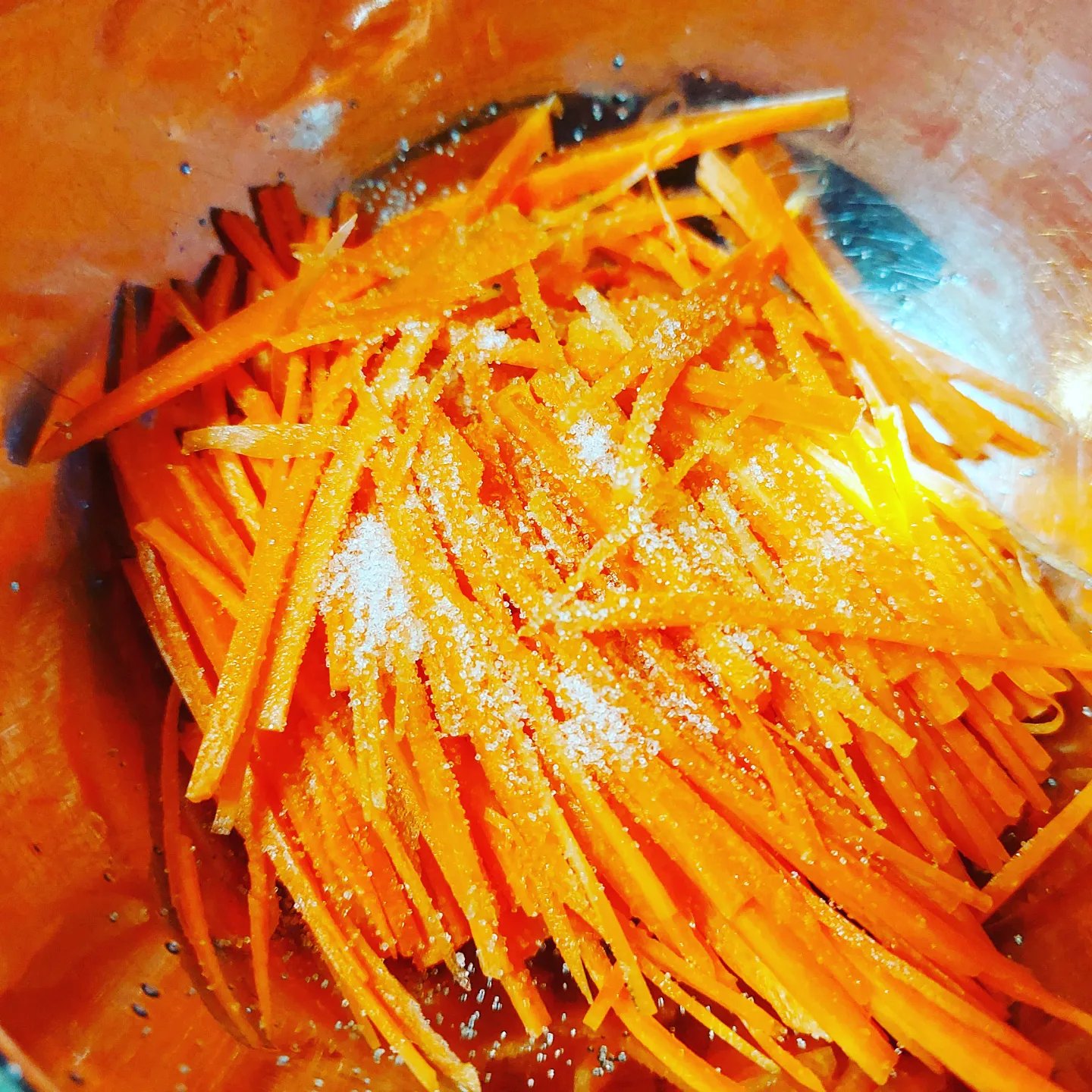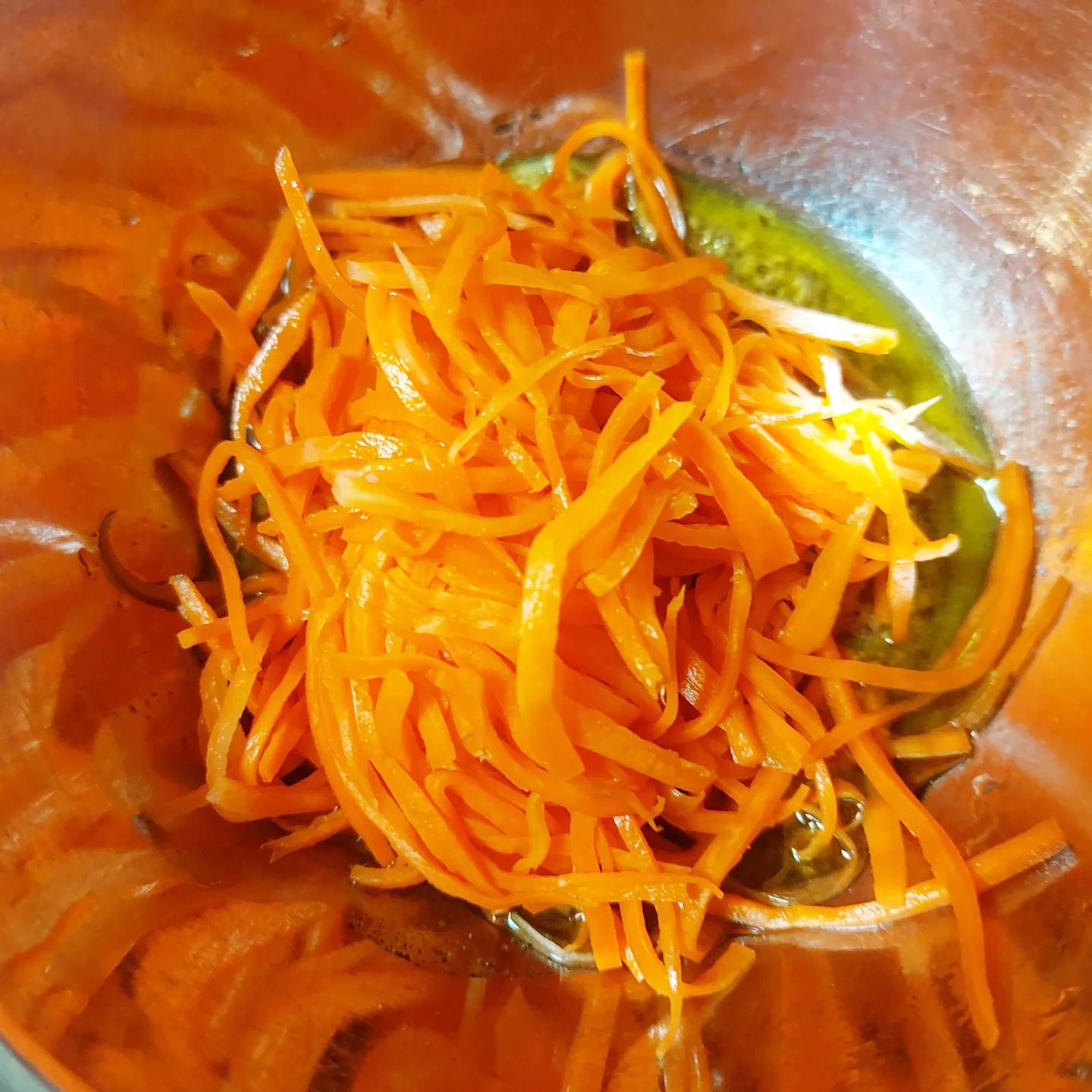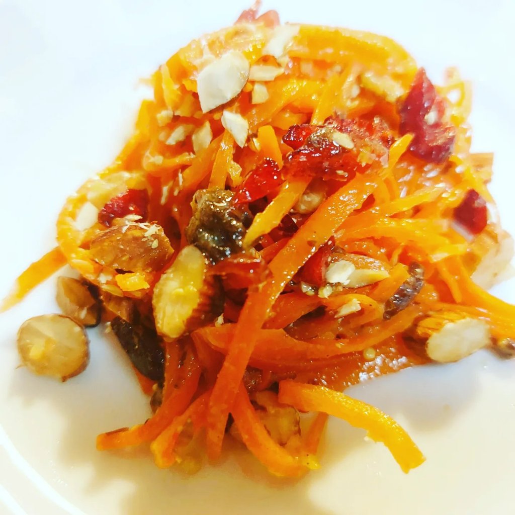 しんなりとしても芯のあるにんじんの歯ごたえと、ナッツのカリカリ感にドライフルーツのアクセントがきいた、ちょっと和風エッセンスのキャロットラペのできあがりです🥕