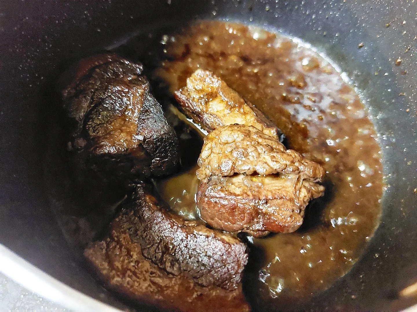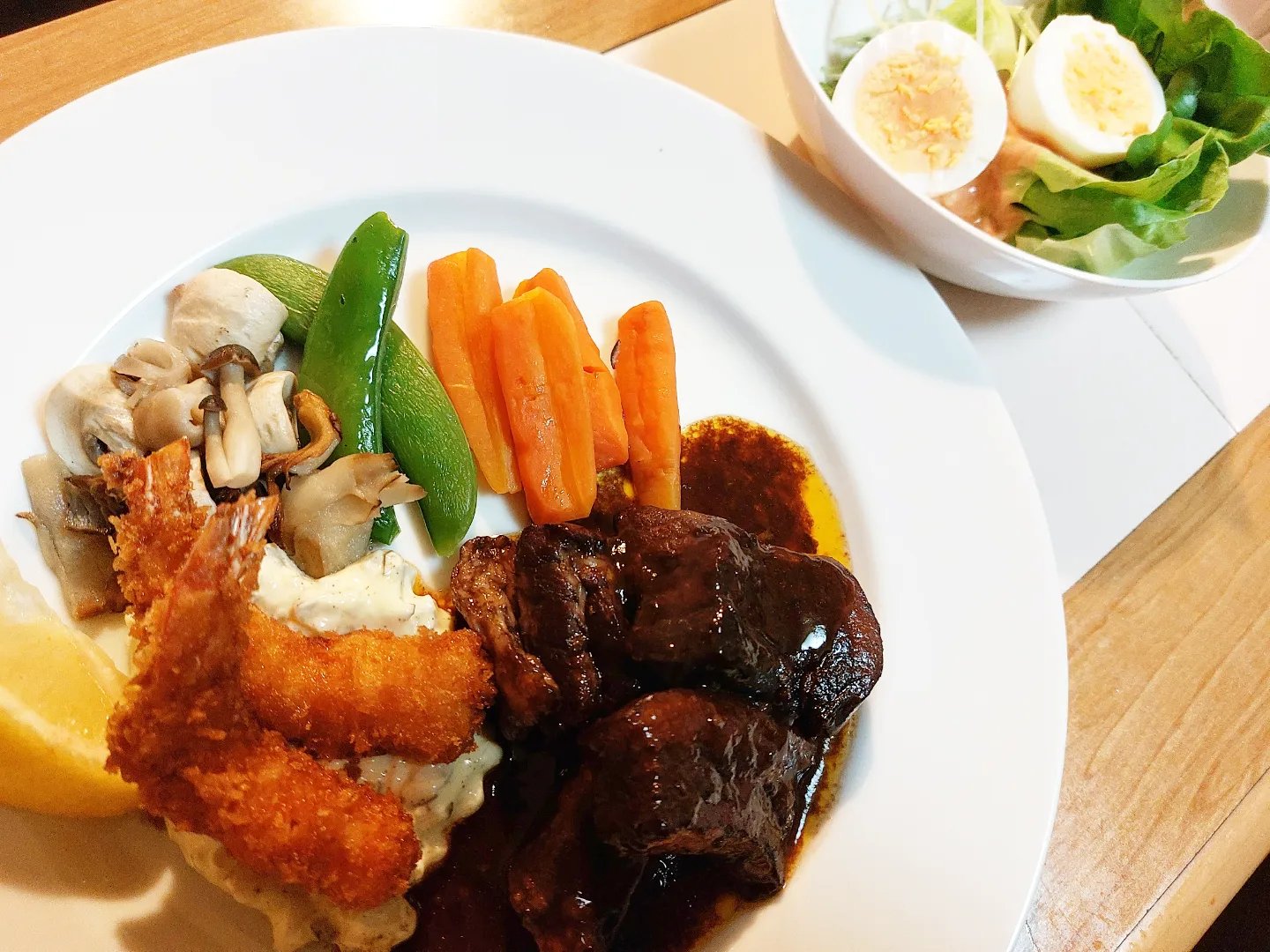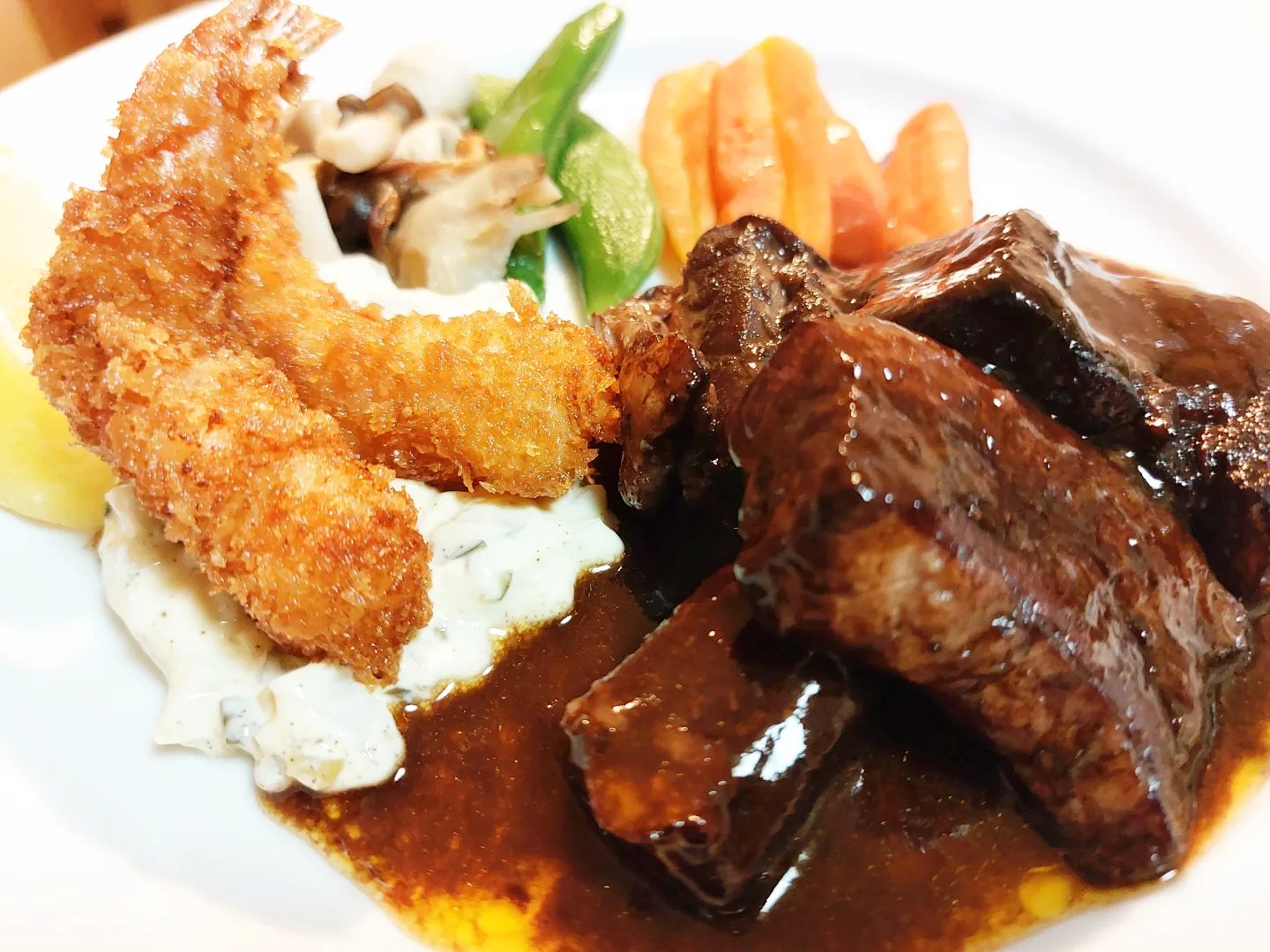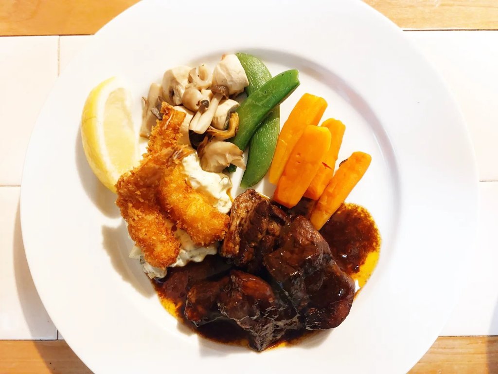 今回の盛り合わせは豚肉の赤ワイン煮込みとエビフライ。
