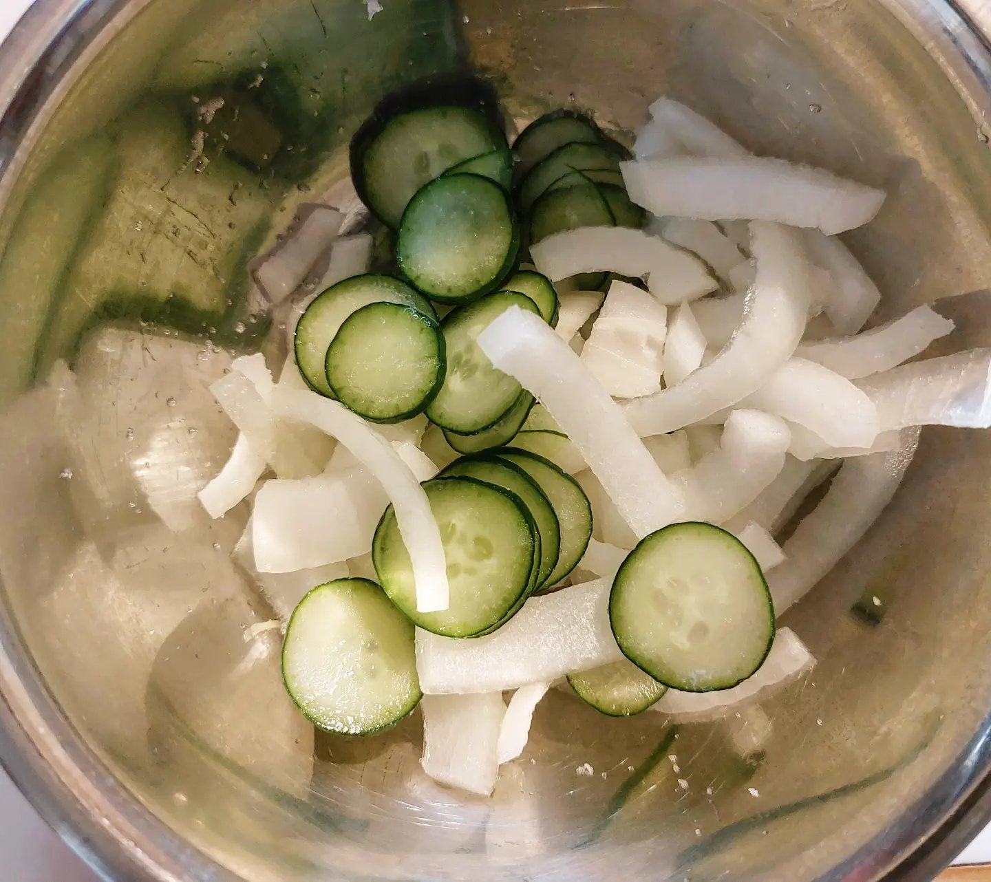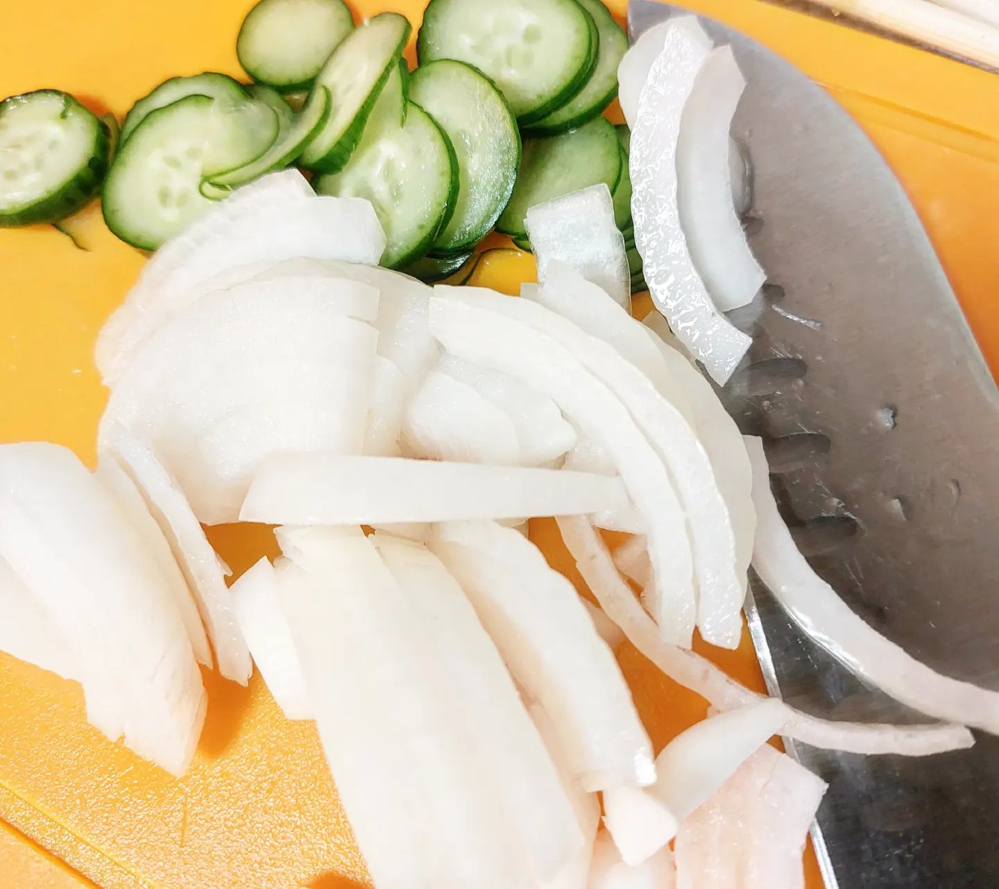 続いて漬け込む野菜の準備です。今回は新玉ねぎときゅうりを使います。