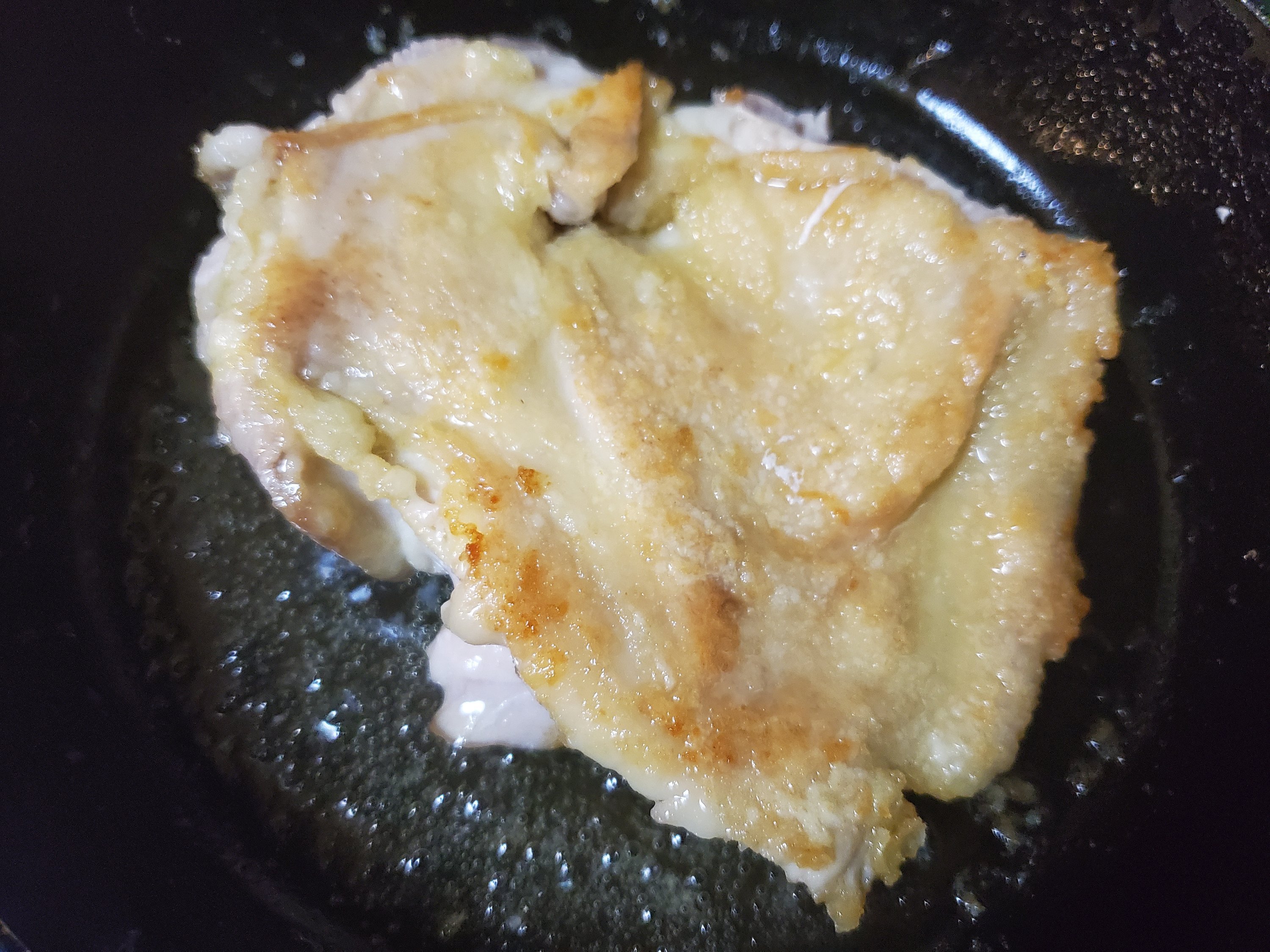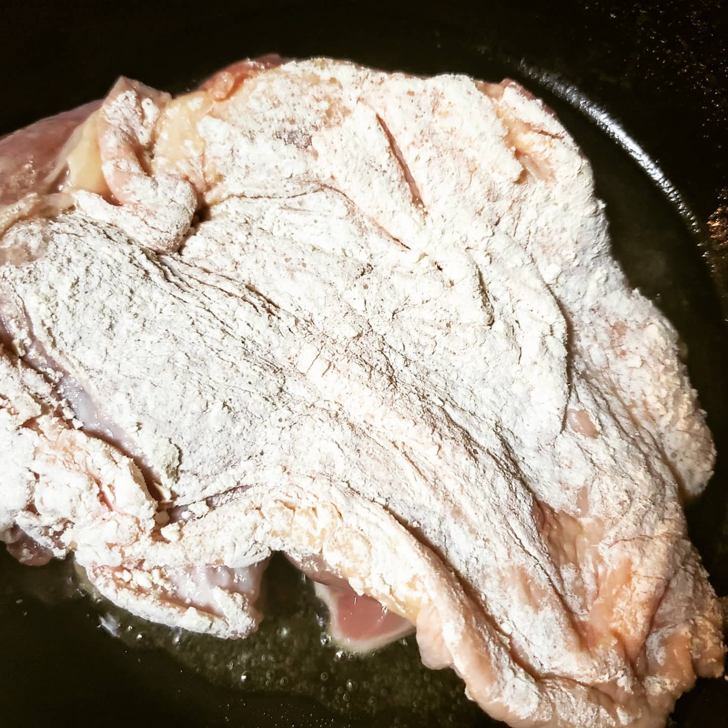 お肉を焼くときは、オイルを敷いたフライパンを煙が出るまで熱して、弱火にしてからお肉を入れます。