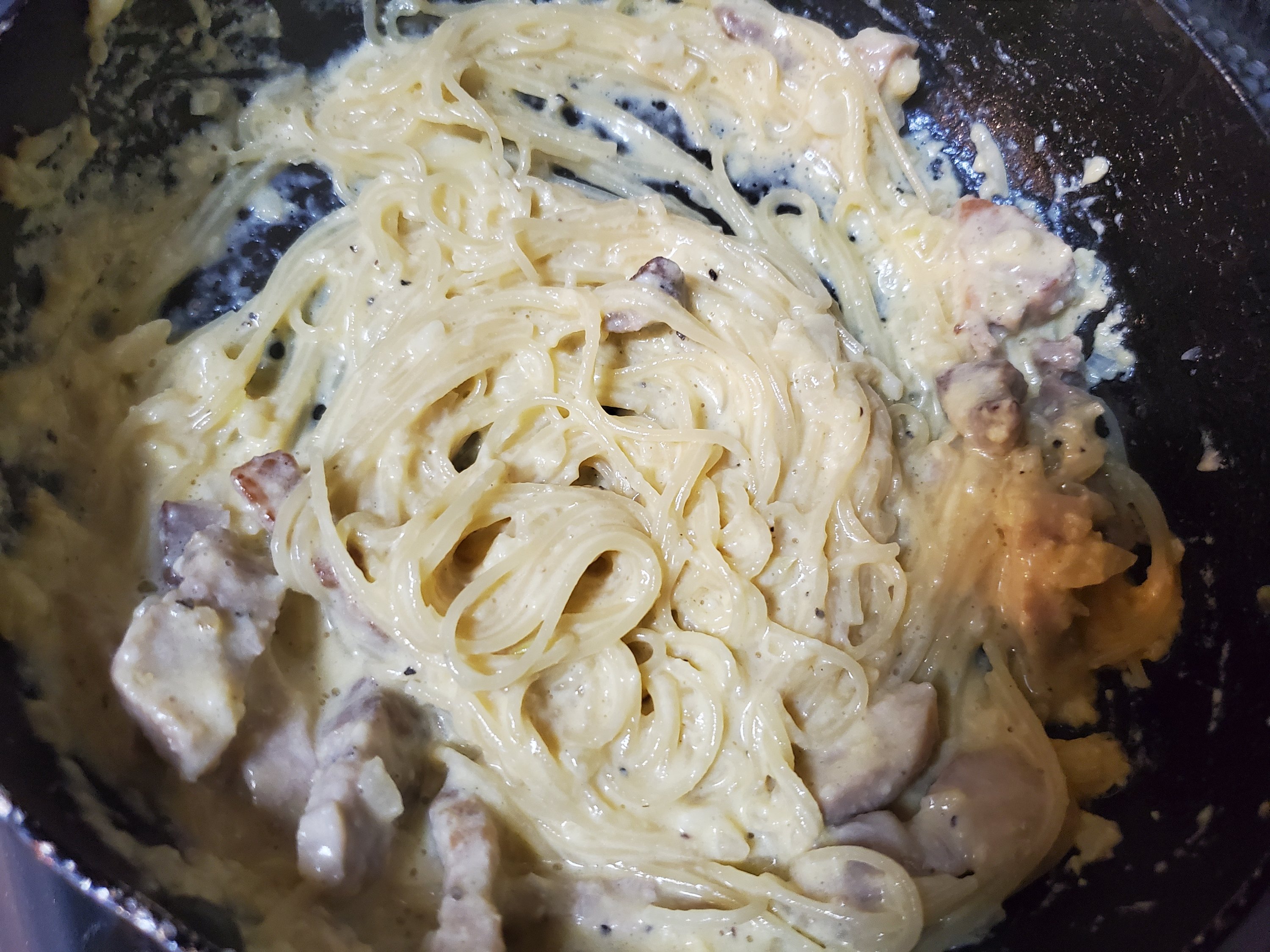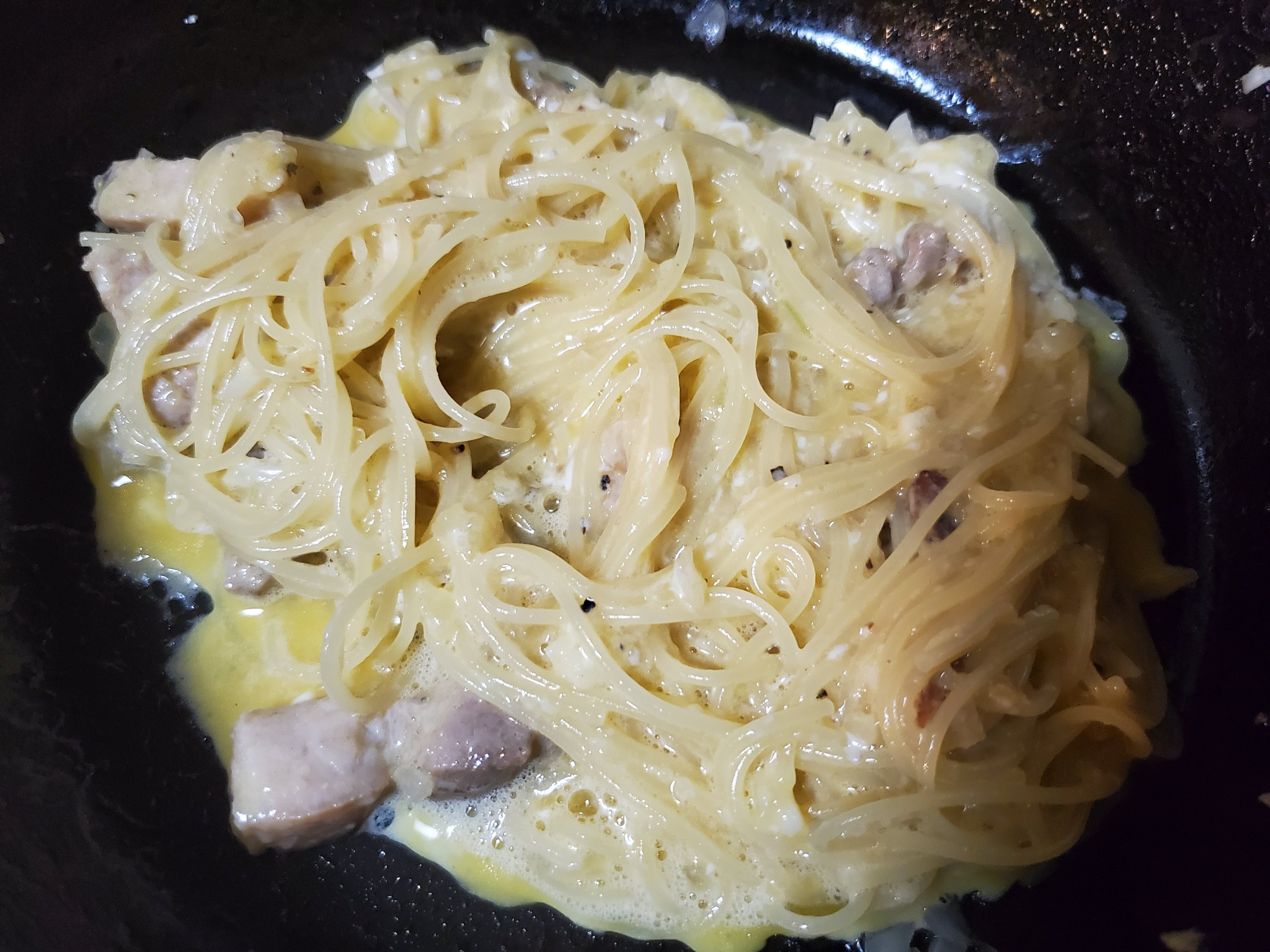 カルボナーラって生クリームを使うイメージがあると思います。そのせいでこの料理のためだけに生クリームを買うのもなぁ…という感じでハードルが上がってるんだと思うのですが、このレシピなら冷蔵庫にある材料でできてお手軽です。