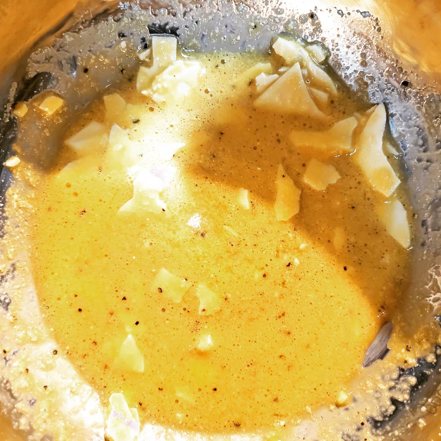 ここで火を強くしてしまうと卵が一気に固まって炒り卵のようになってしまうので、あくまで弱火でじわじわがポイントです。
