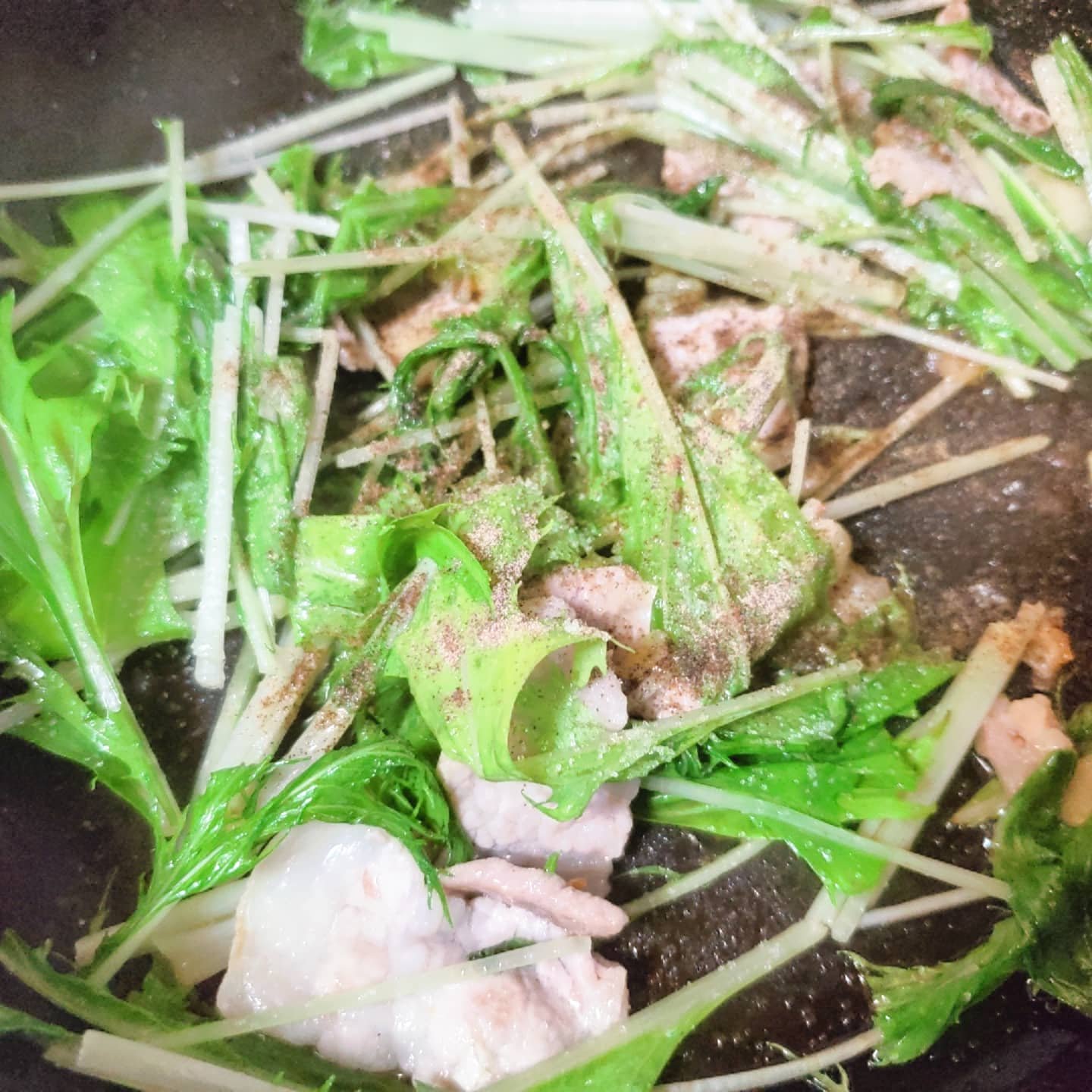 水菜はサラダにしても、煮ても美味しい素材ですが、今回はメインのひと品に使いたいと思って、豚バラと一緒に自家製のねぎ油で炒めてみることにしました。
