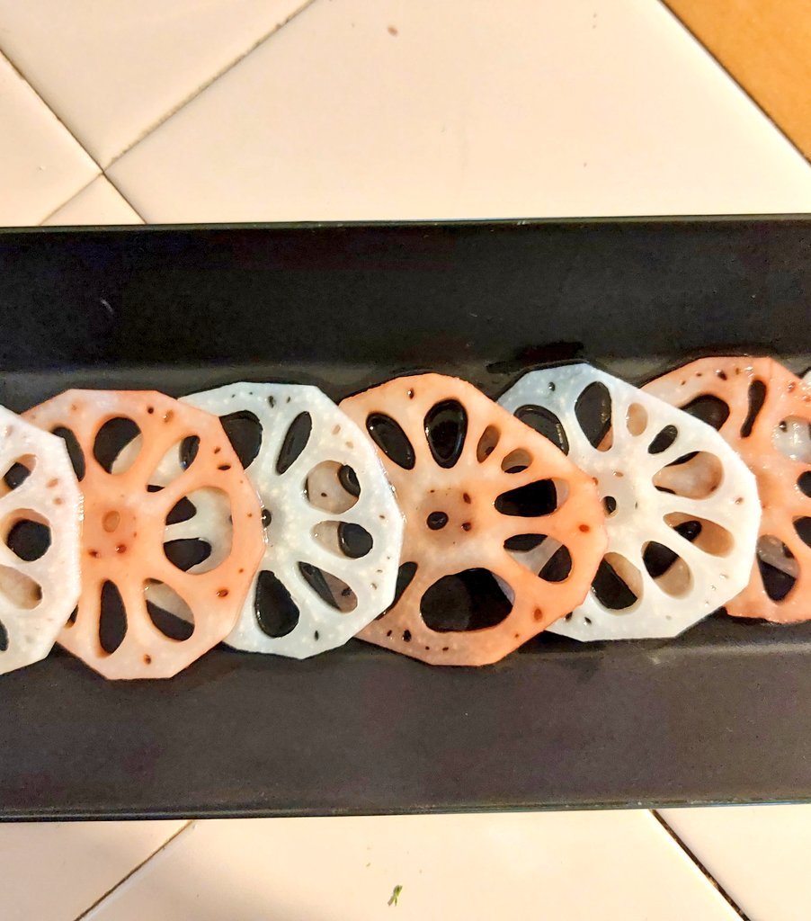 赤いれんこんは漬け汁に煮切った赤ワインを足したものです。
