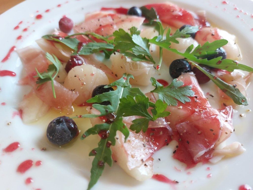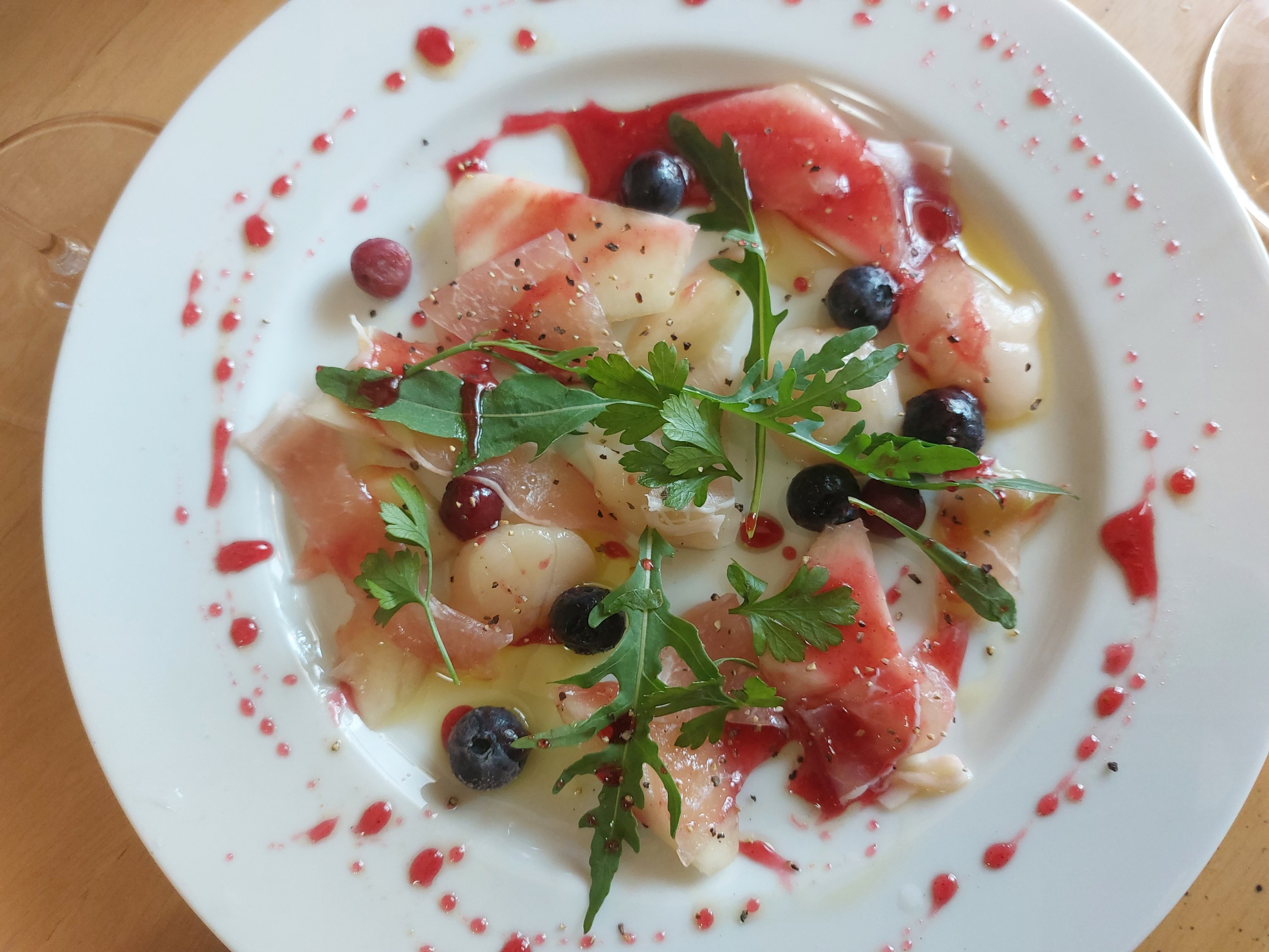 ホタテ、ブルーベリー、桃、生ハムを盛りつけて、ザクロ酢のソースを飾ります。
