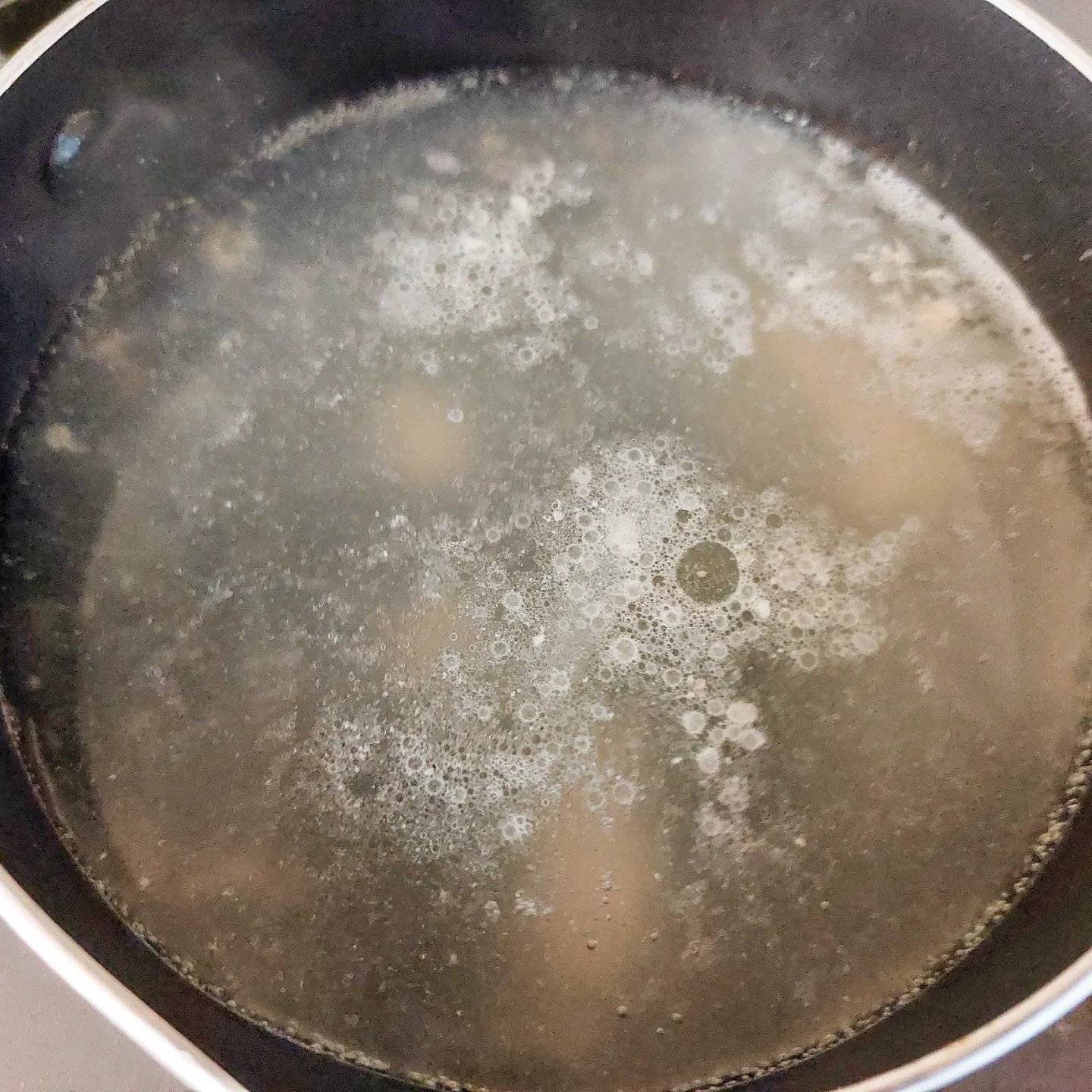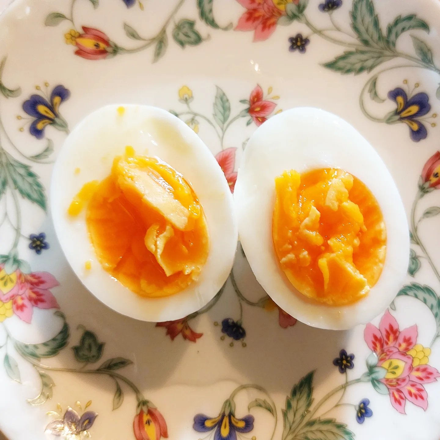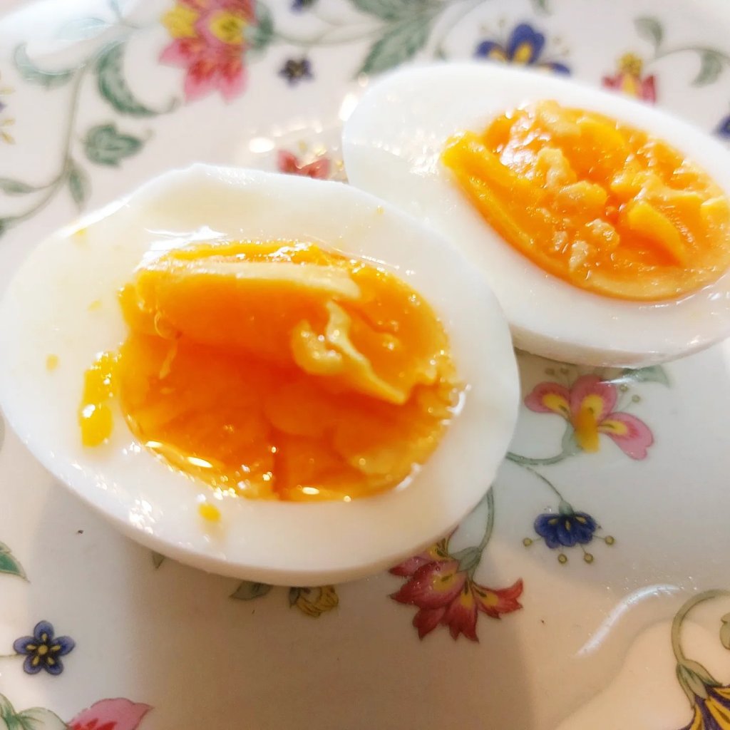 卵のサイズで変わりますが、これくらいの茹で加減で、半熟をすこし通りすぎたくらいの黄身の固まり具合に仕上がると思います。