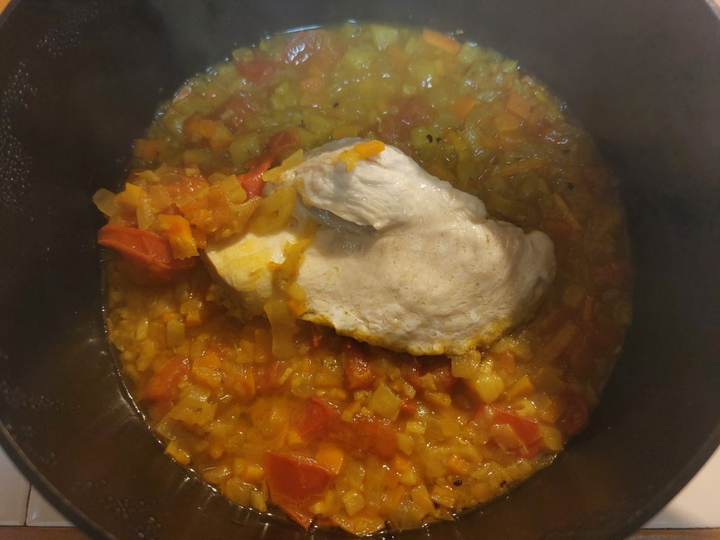 このまま蓋をして火にかけ、沸いてきたら弱火でじっくり20分ほど煮込みます。