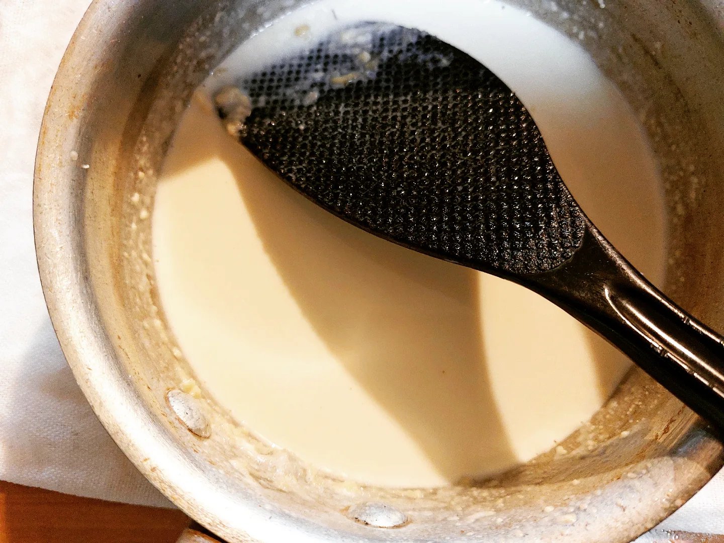 火にかけたまま牛乳を入れるとだまができやすくなりますが、一度冷まして火からおろすとなめらかに仕上げやすいです。