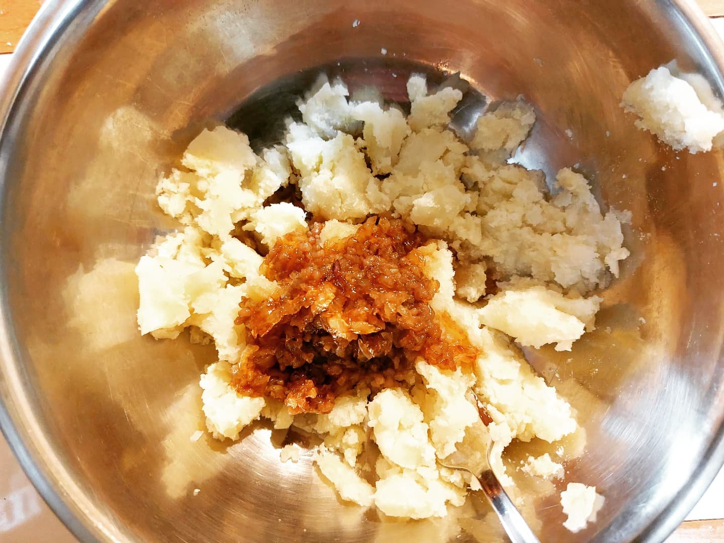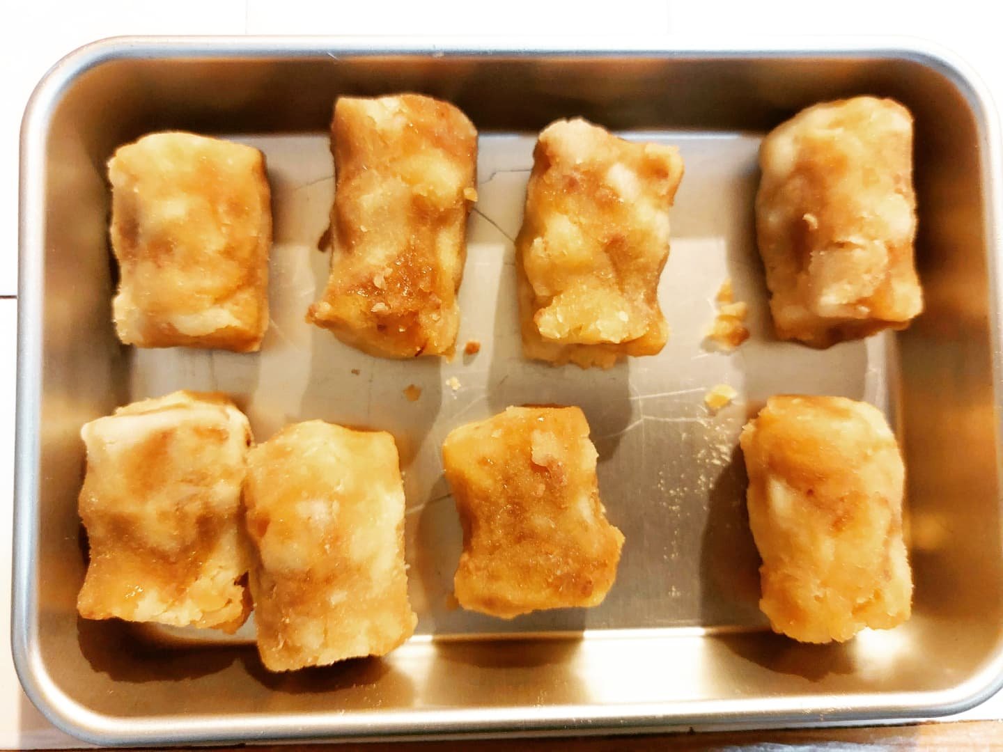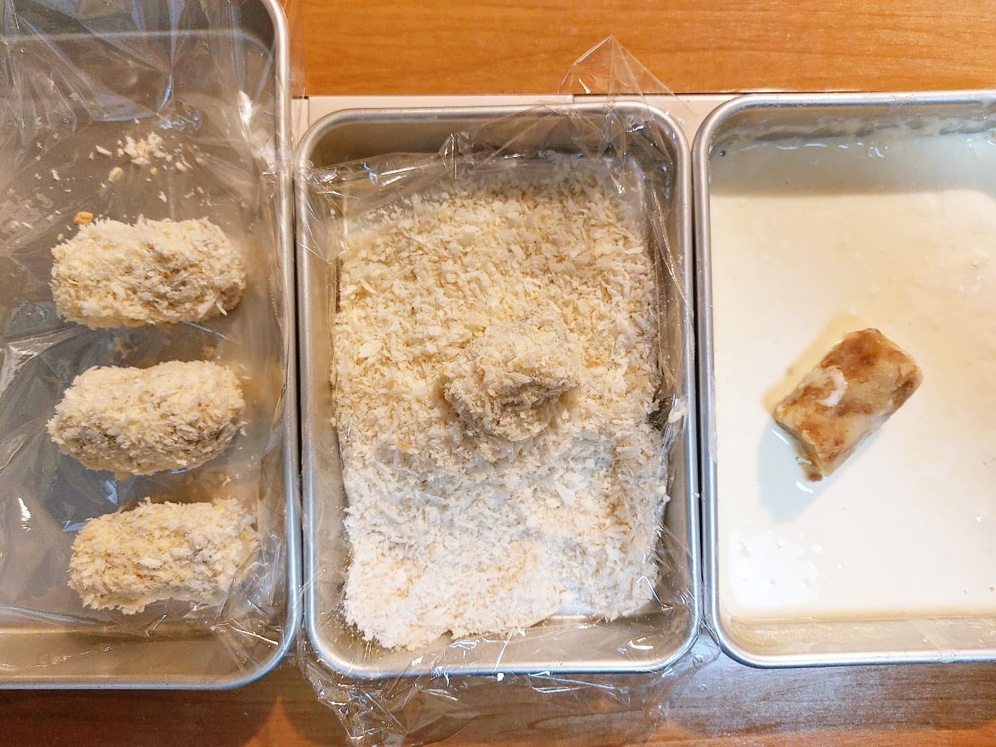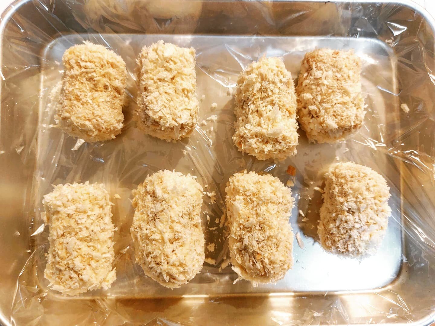 お肉屋さんのコロッケは小判型でしたが、冷凍してお弁当に使ったりもするので、今回はお弁当箱にも入れやすい俵型です。