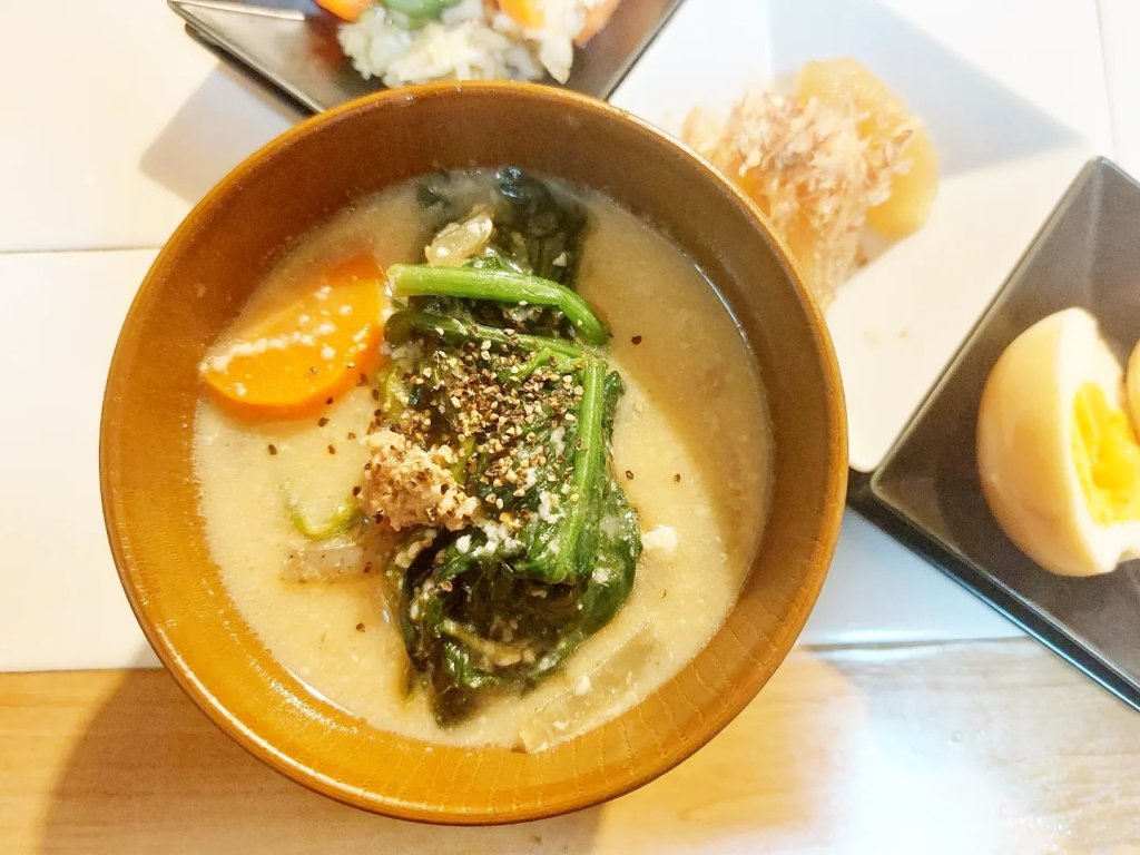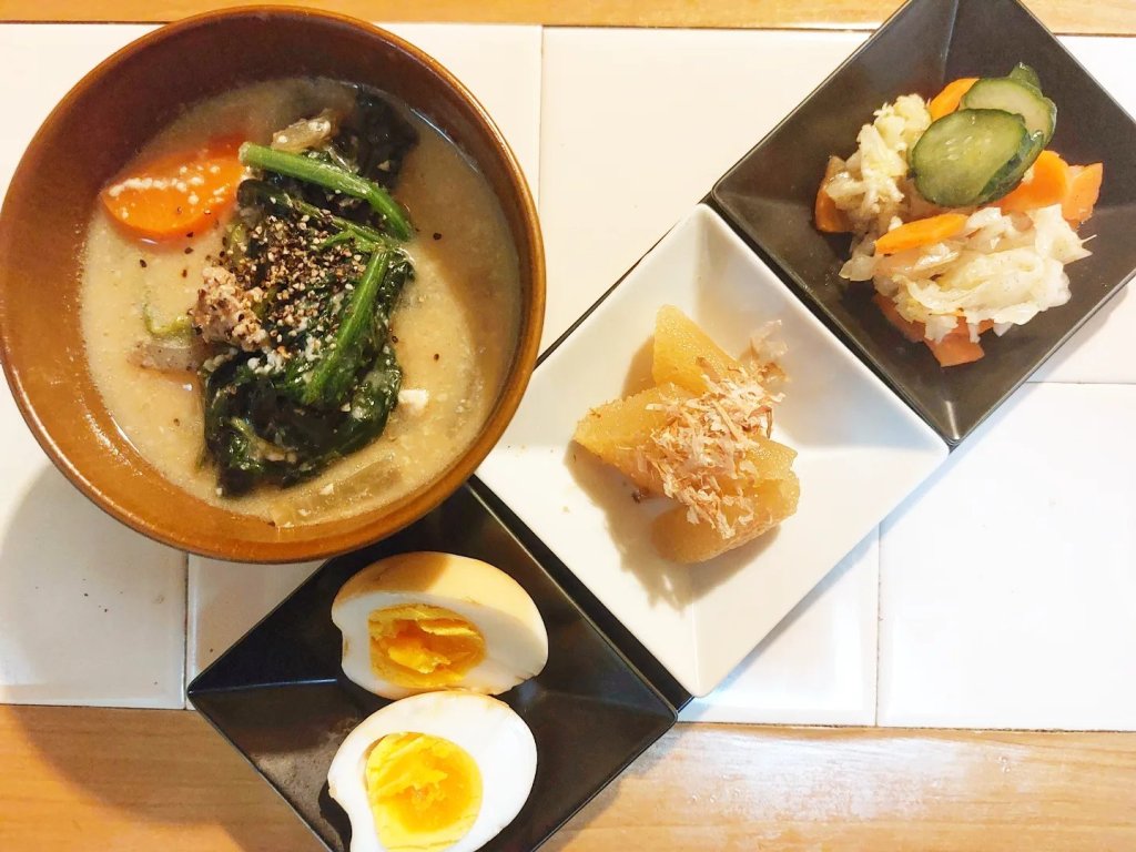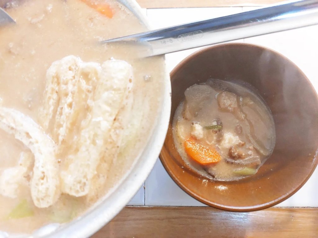 忘れてはならないのは、具だくさんのおつゆ。鍋物とは似て非なる、お椀や丼で一人前ずつ直宅に並ぶ、けんちん汁に豚汁。たっぷりの野菜もとれてヘルシーな感じもします。