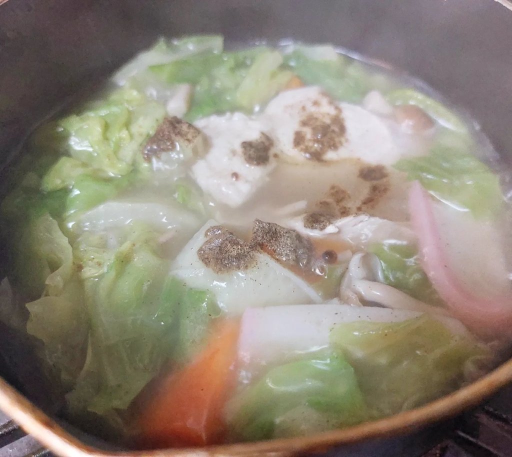 お鍋的な感じの具と、彩りにカマボコも投入。