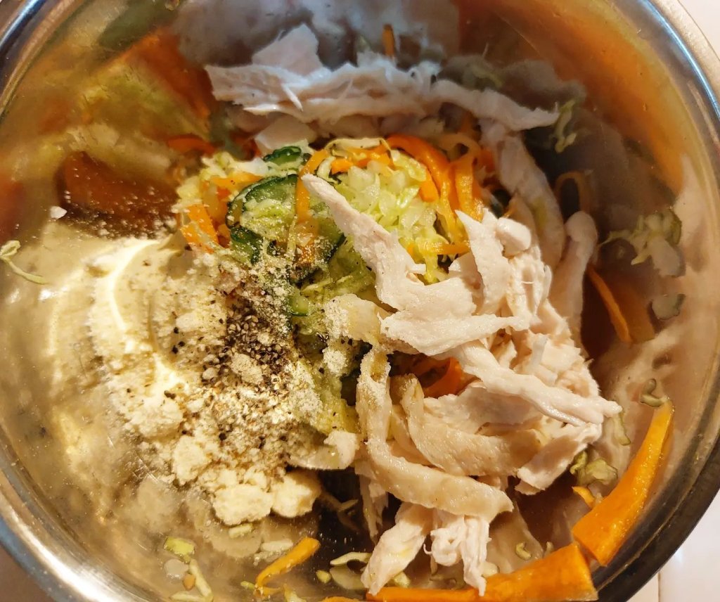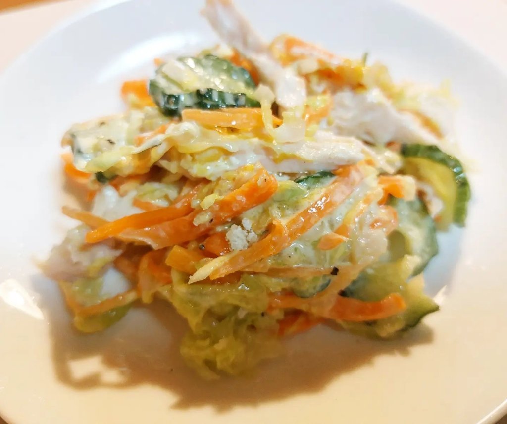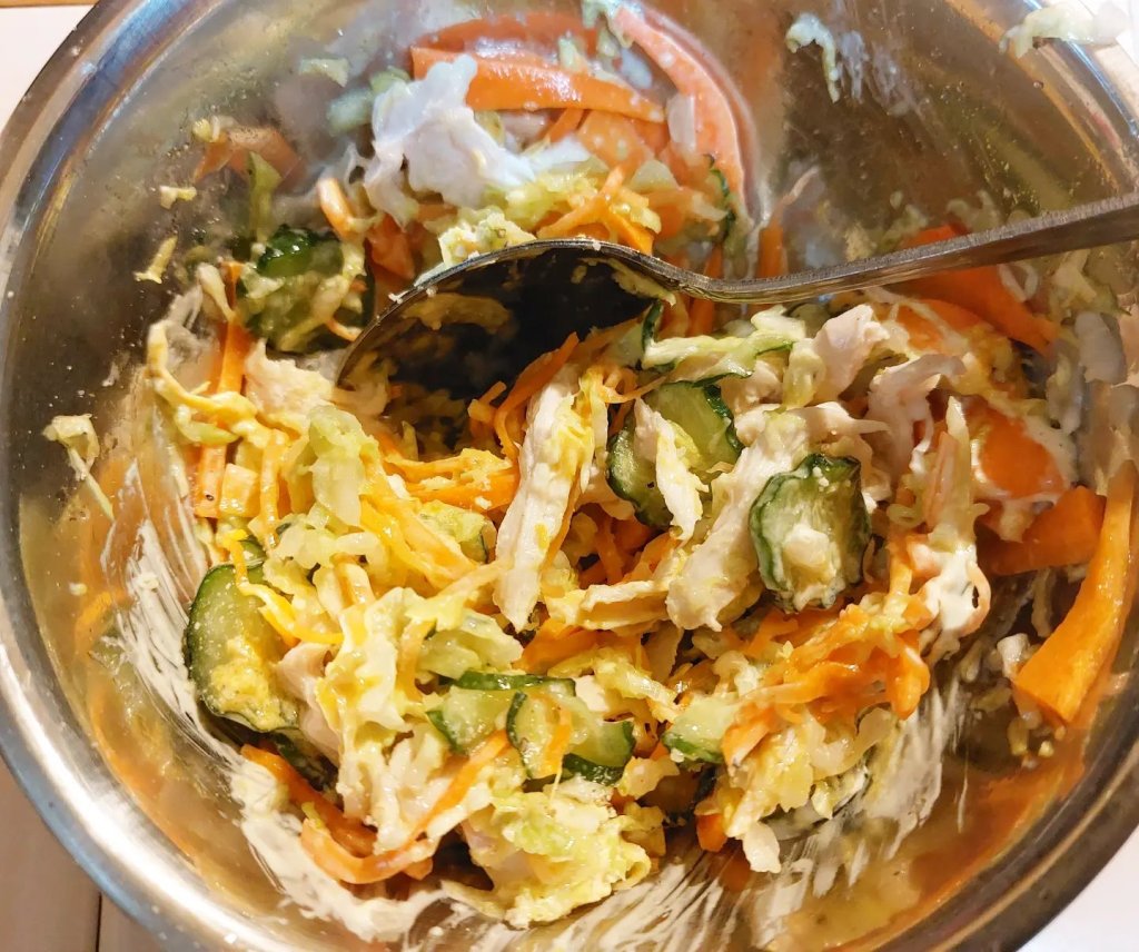 鶏肉が入ると一気に食べ応えがアップ。サンドイッチにしても美味しいチキン入りコールスローです。