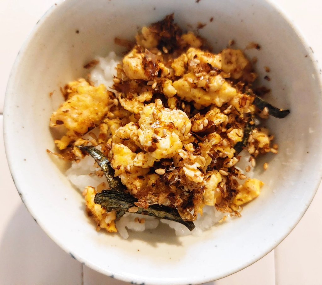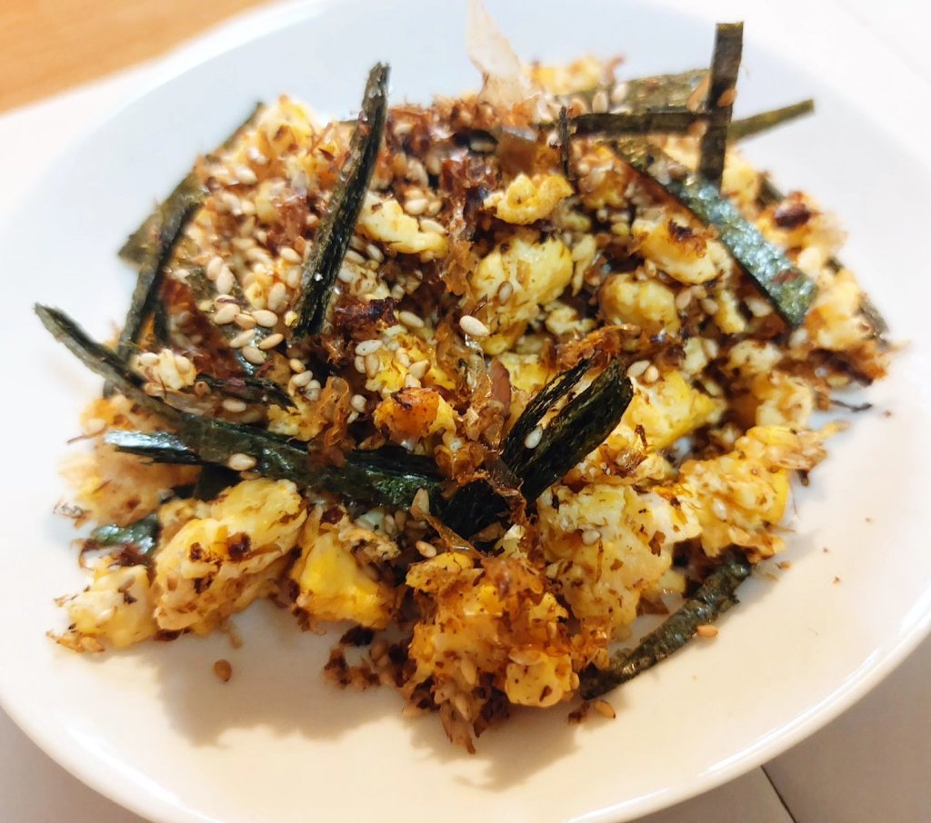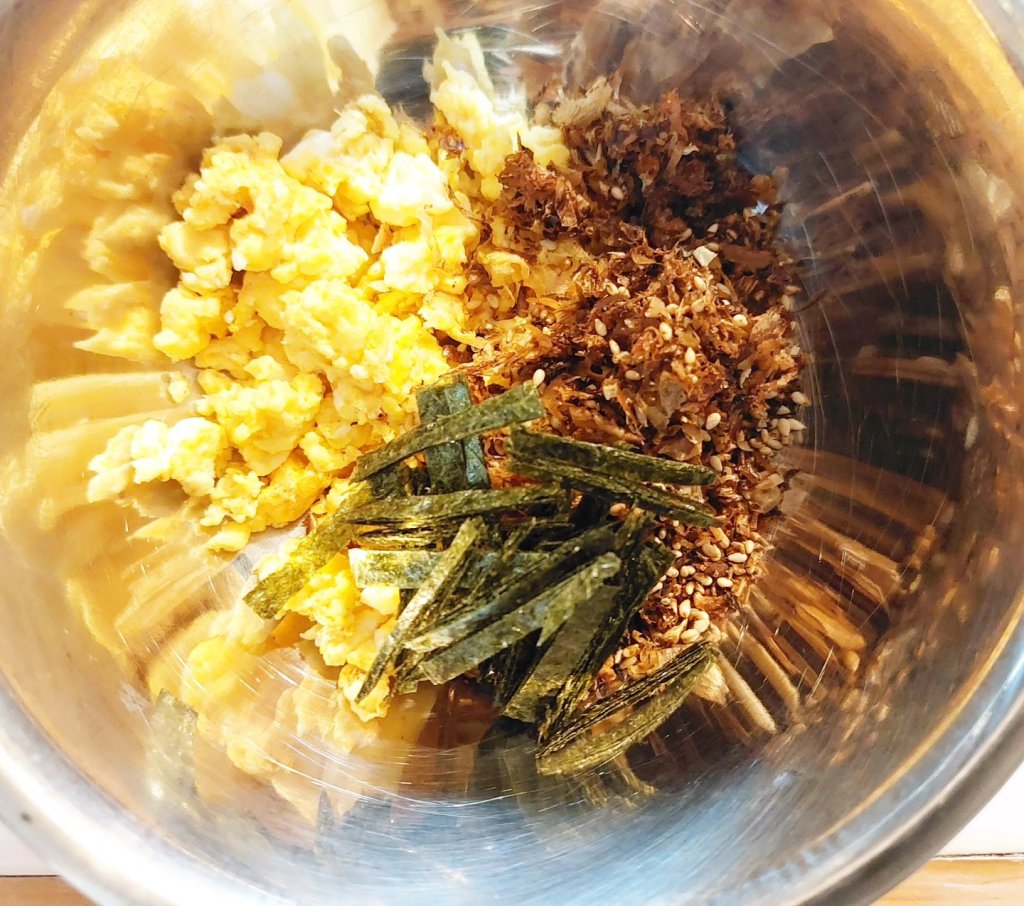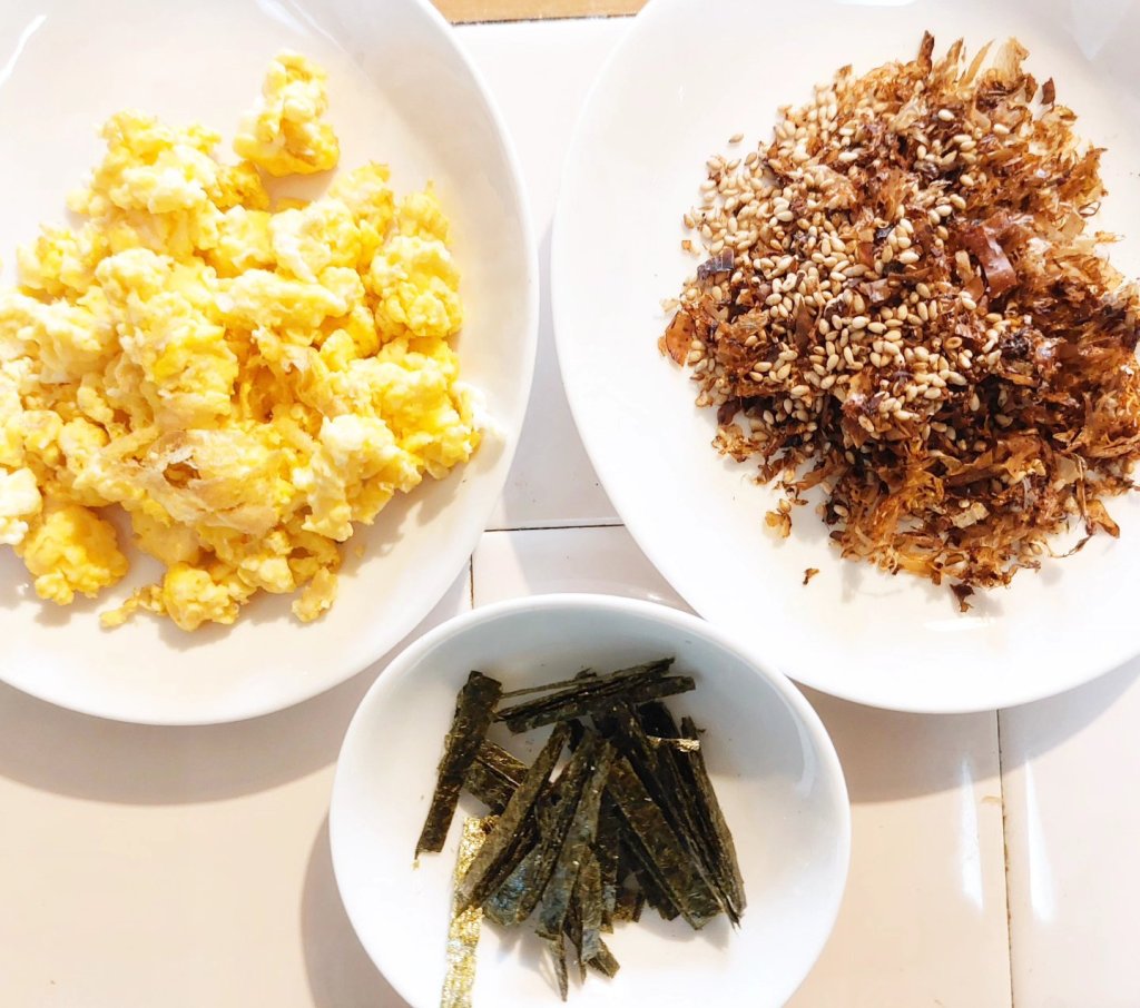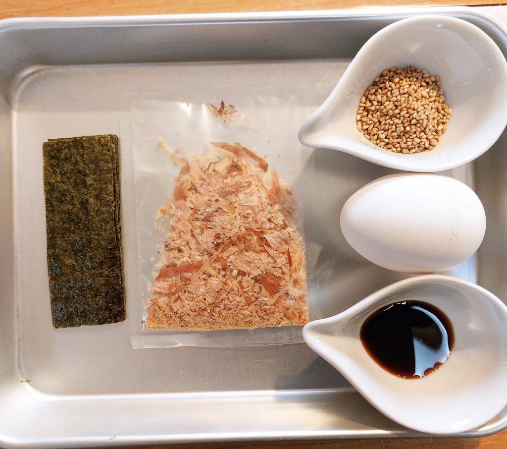 醤油のからんだおかかの香ばしい香りと、たまごのまろやかさ、アクセントの海苔。