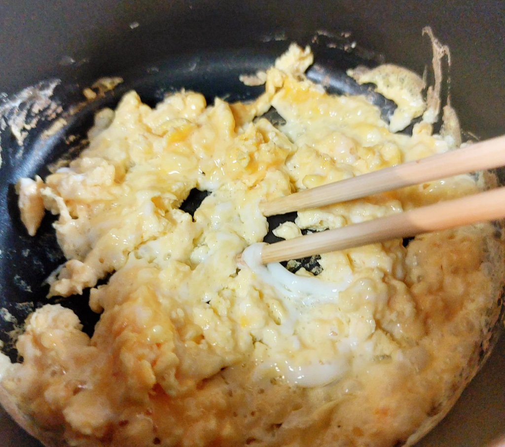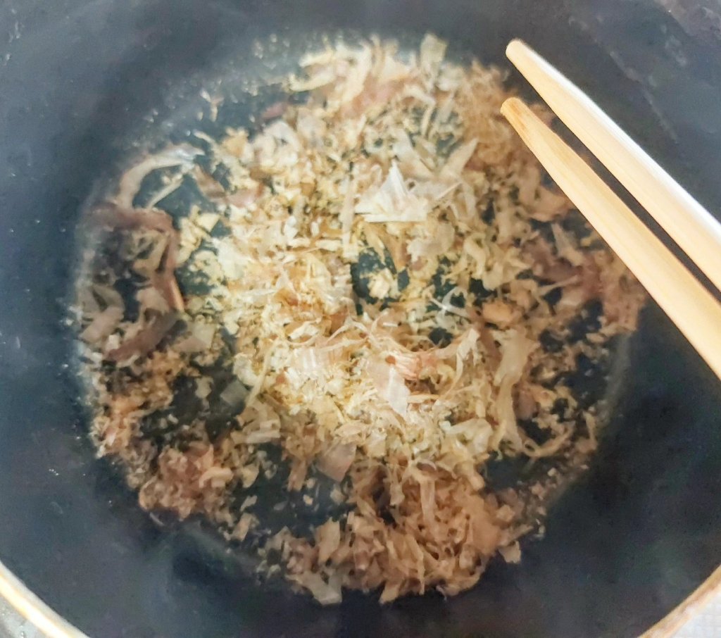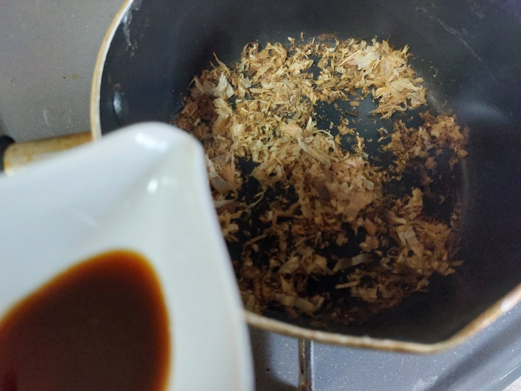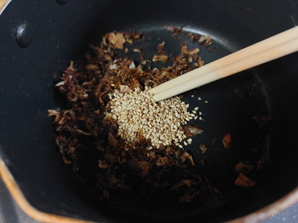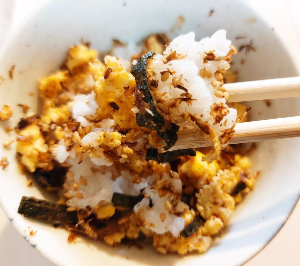 醤油のからんだおかかの香ばしい香りと、たまごのまろやかさ、アクセントの海苔。