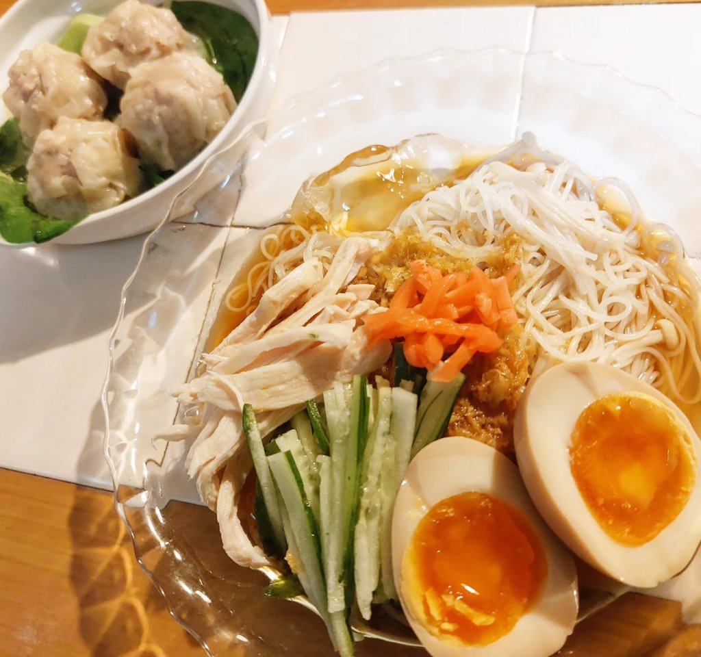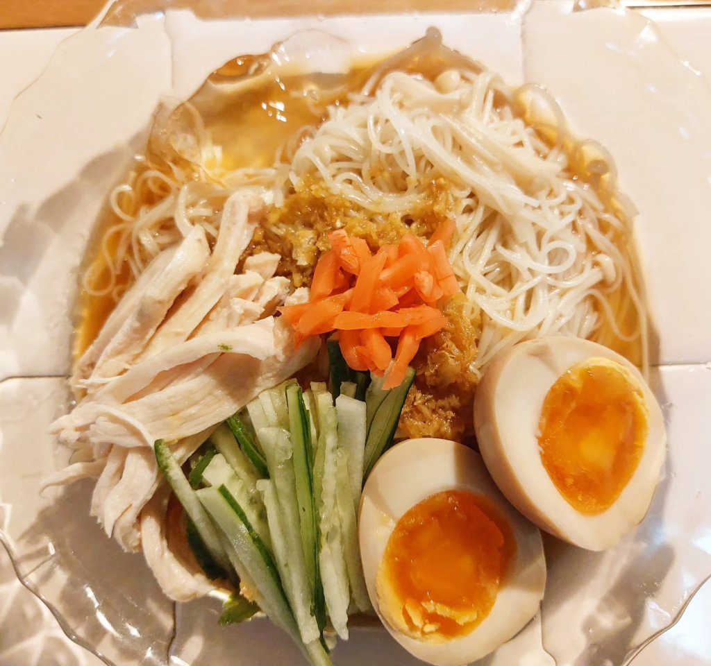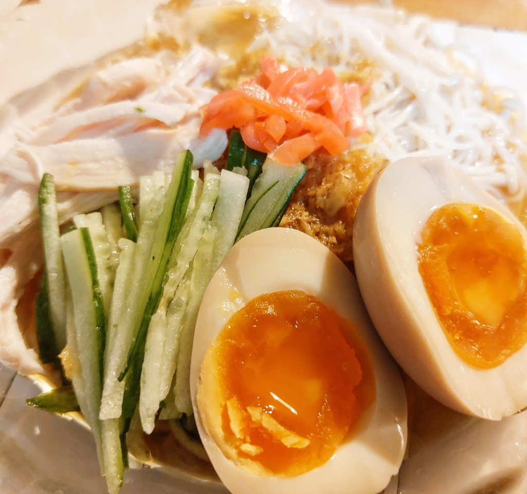 今回は鶏ハム、きゅうり、味玉に紅しょうが。もちろん普通のハムに錦糸卵でもOK。